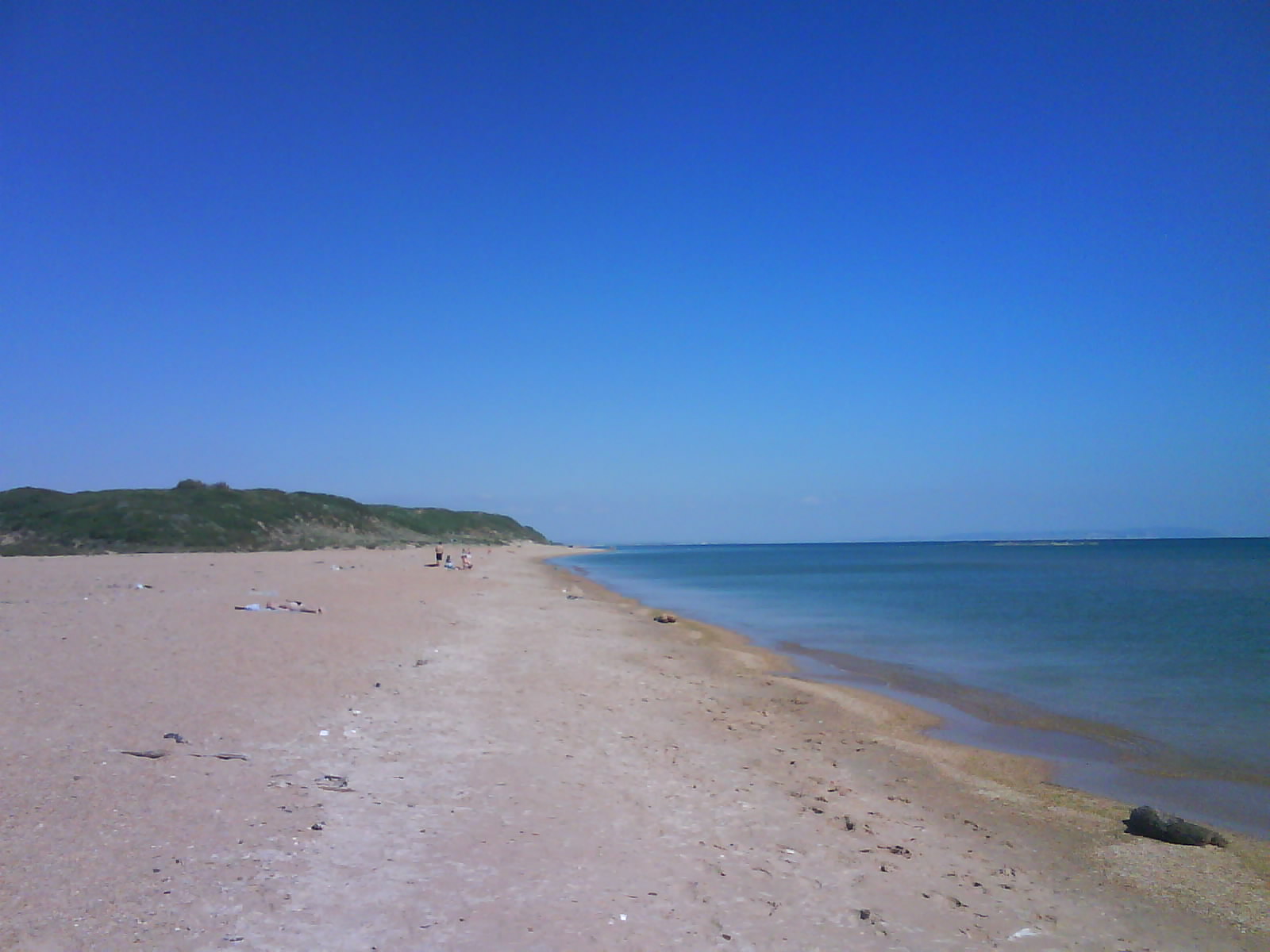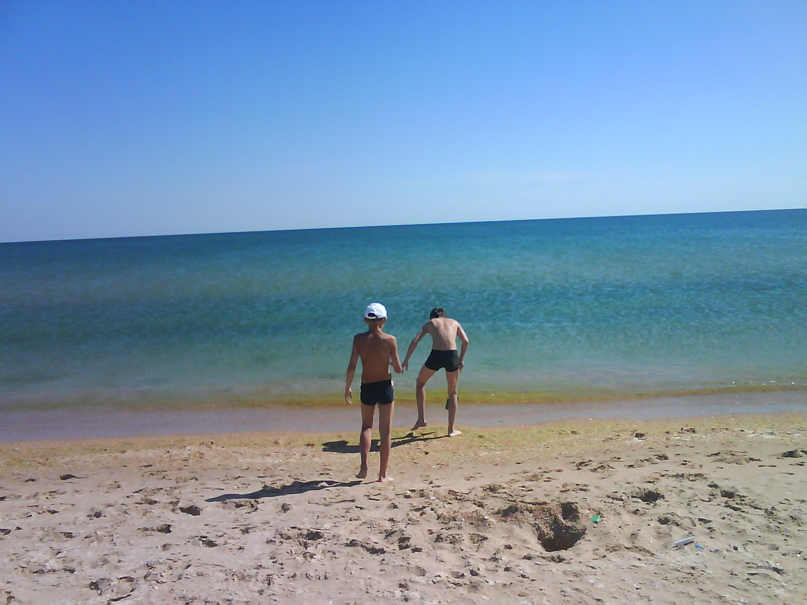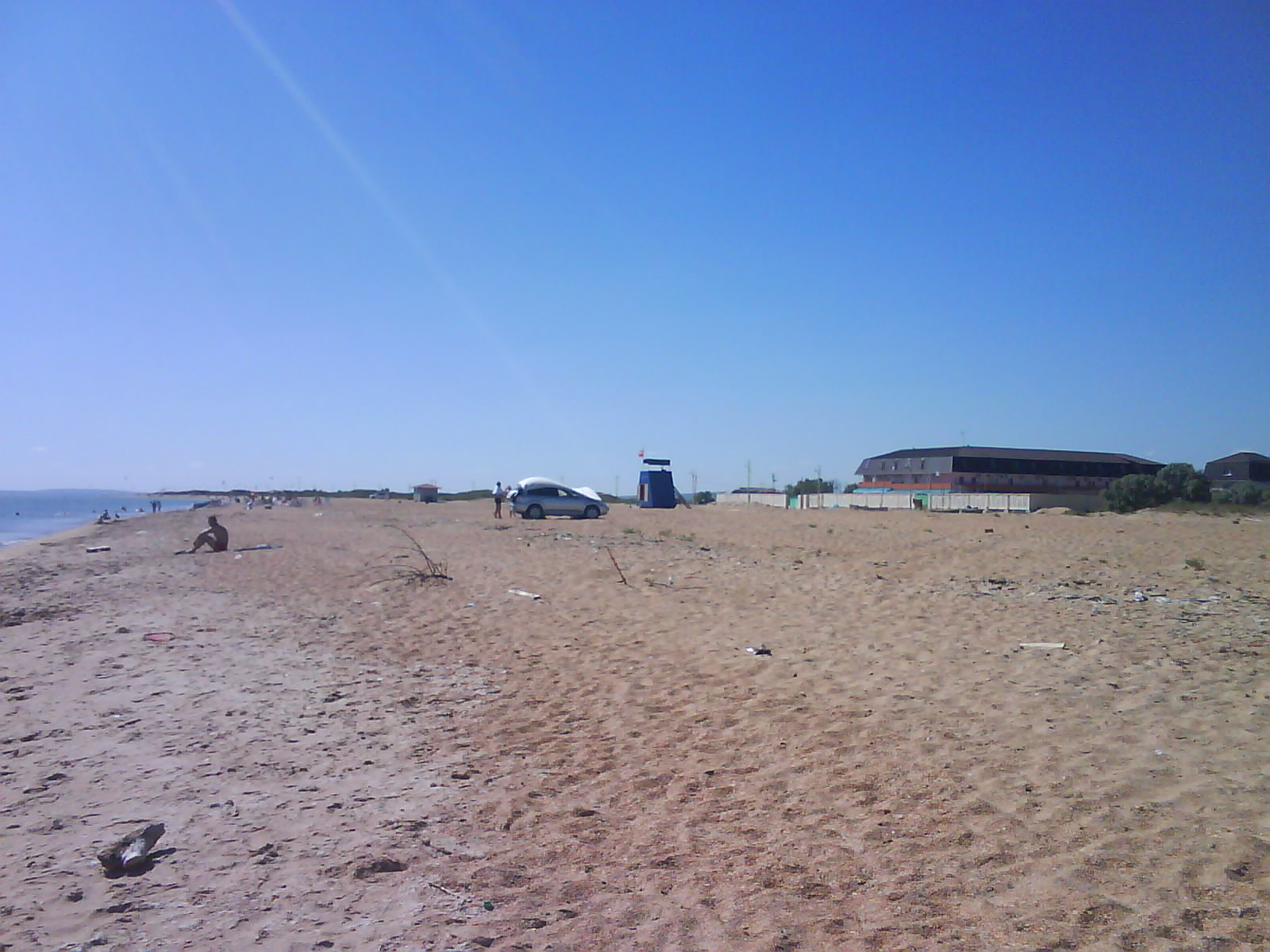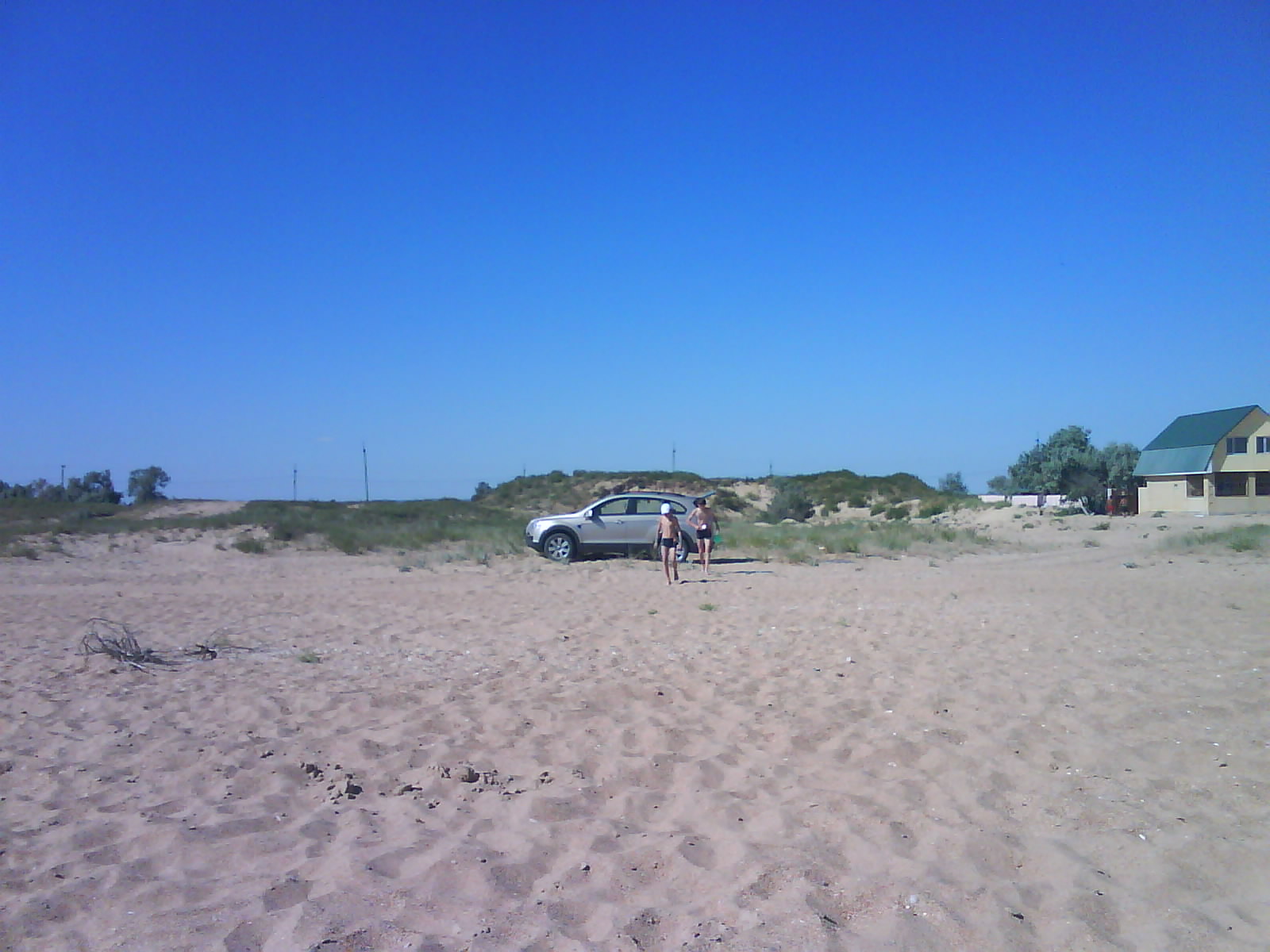 После обеда поехали на ченое море. Есть такое местечко: Виноградное, под Анапой (от Голубицкой до Анапы 58 км.), там можно было съехать прямо на пляж. Именно "можно было". Небольшое наблюдение: все побережье в заборах-загородках "...закрыто крепко все на крючья и запоры..."(Александр Новиков). Долго пылили вдоль моря - заборы, стройки... Наконец узрели - вот оно! На форум читал, как паршиво Каптюша ездит по песку, да еще супруга:"...сейчас застрянем!...все! я выхожу!.." Вот ненадо никого слушать. Нормаль Каптюша по песку ездит. Там, совсем уж у воды стоял старый аутлэндер. И ничего, выполз без вопросов. Черное море - прозрачное, только водоросли...как в болоте. Пляж широченный, народу - по одному человеку на гектар. Изумительно, понравилось. Кстати кукурузу купили на маленьком рынке, по 40руб. за початок. Еще купили малеькую дыньку и огурцы малосольные. Огурцы слопали сразу, такие вкусные.