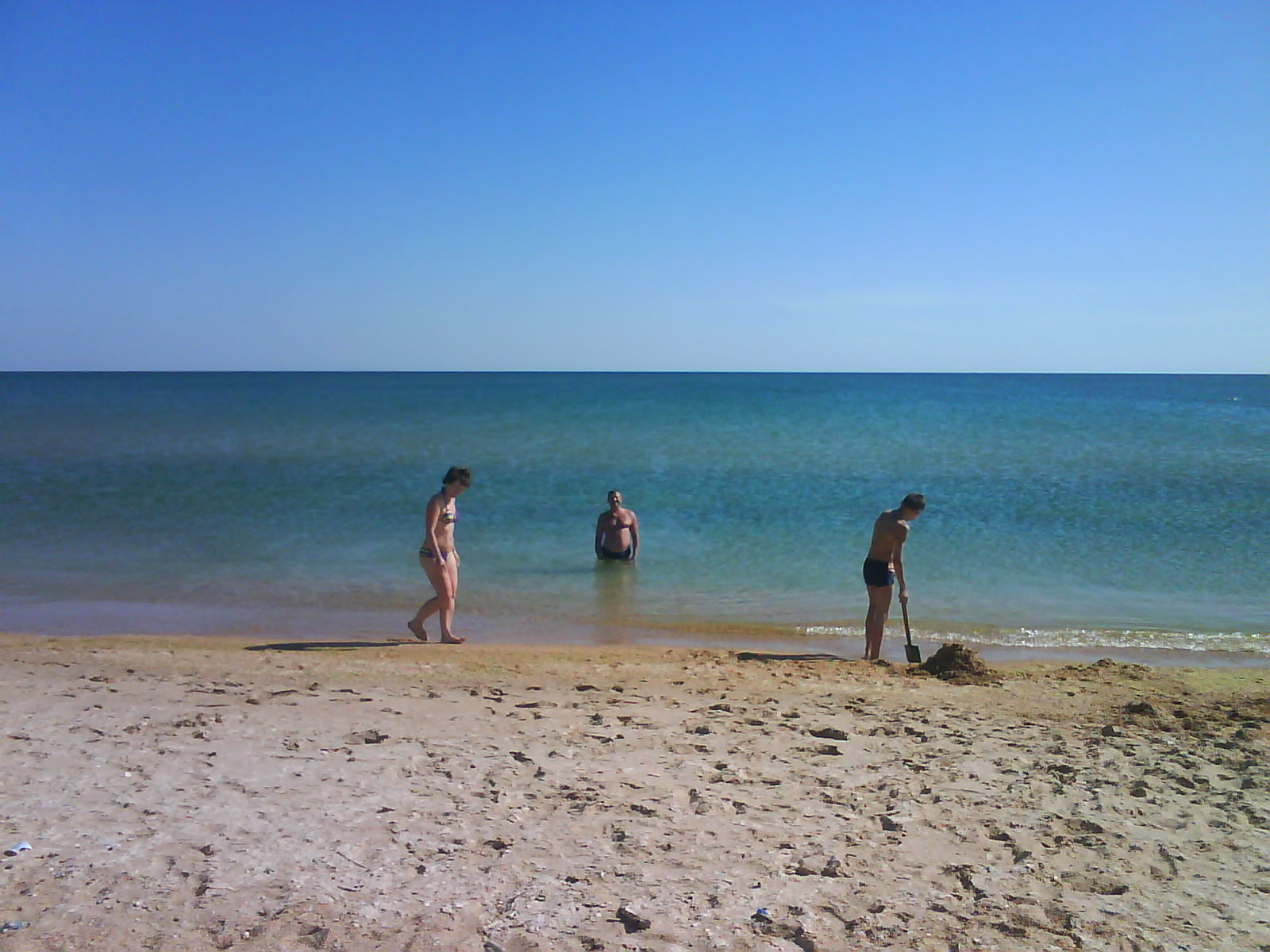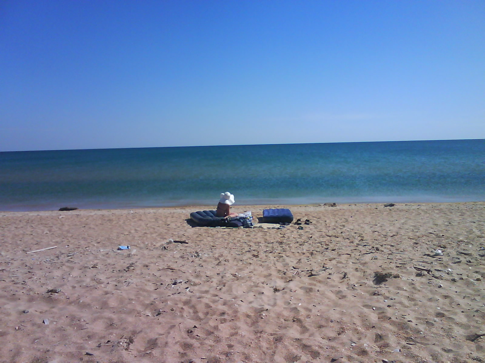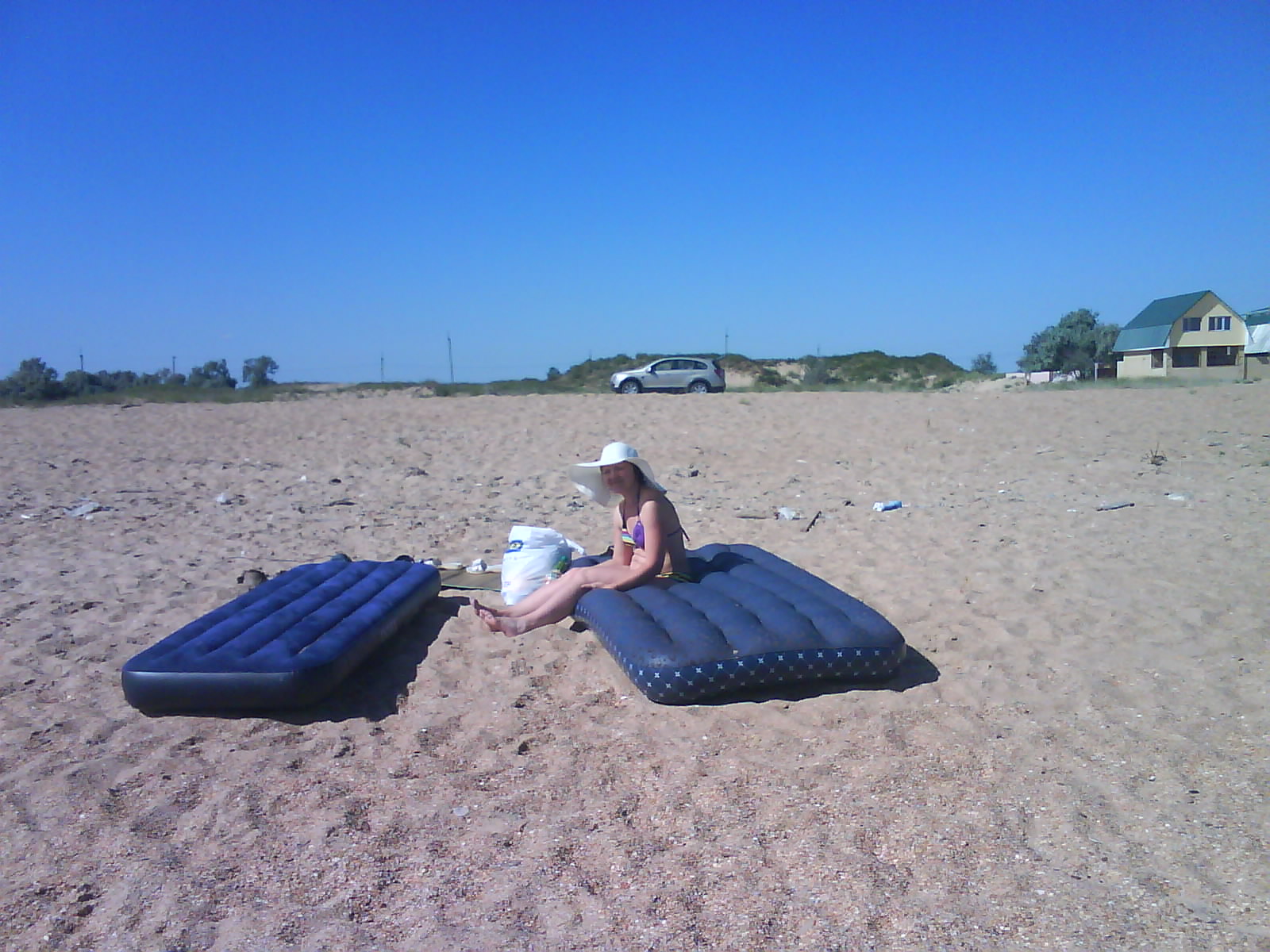 После обеда поехали на ченое море. Есть такое местечко: Виноградное, под Анапой (от Голубицкой до Анапы 58 км.), там можно было съехать прямо на пляж. Именно "можно было". Небольшое наблюдение: все побережье в заборах-загородках "...закрыто крепко все на крючья и запоры..."(Александр Новиков). Долго пылили вдоль моря - заборы, стройки... Наконец узрели - вот оно! На форум читал, как паршиво Каптюша ездит по песку, да еще супруга:"...сейчас застрянем!...все! я выхожу!.." Вот ненадо никого слушать. Нормаль Каптюша по песку ездит. Там, совсем уж у воды стоял старый аутлэндер. И ничего, выполз без вопросов. Черное море - прозрачное, только водоросли...как в болоте. Пляж широченный, народу - по одному человеку на гектар. Изумительно, понравилось. Кстати кукурузу купили на маленьком рынке, по 40руб. за початок. Еще купили малеькую дыньку и огурцы малосольные. Огурцы слопали сразу, такие вкусные.