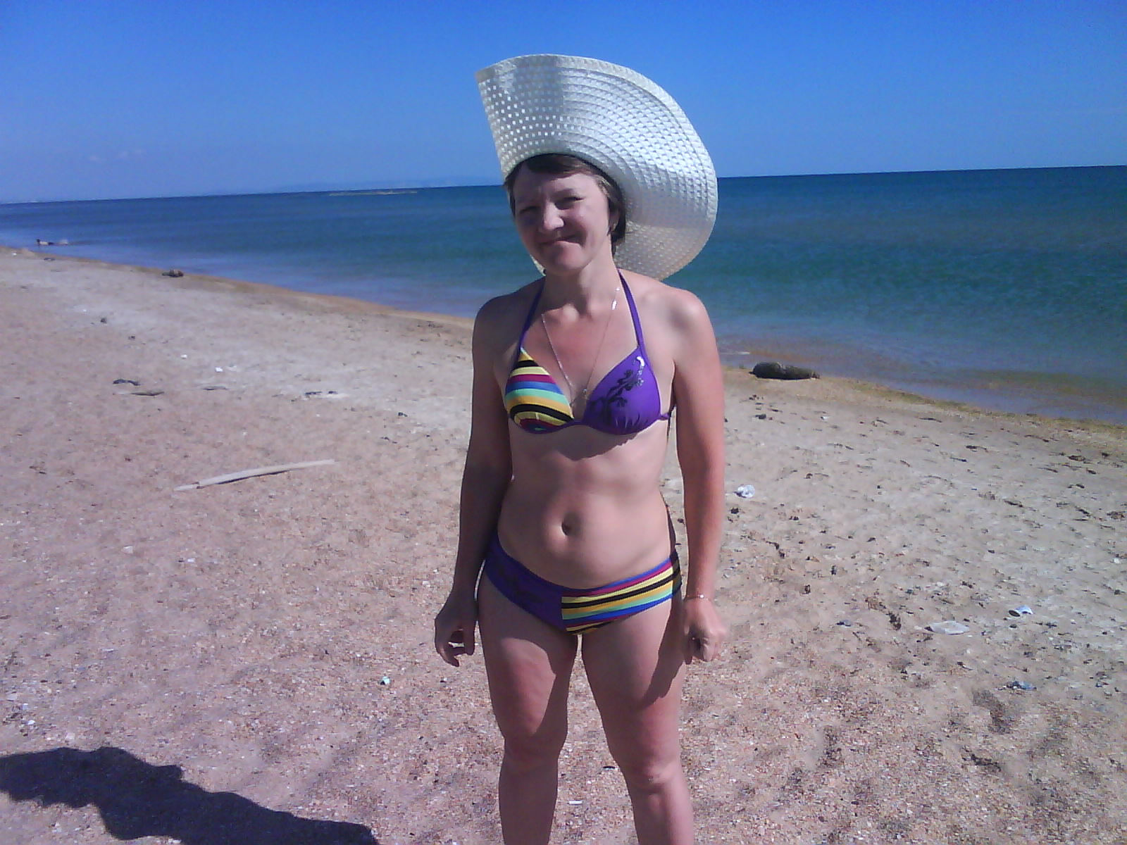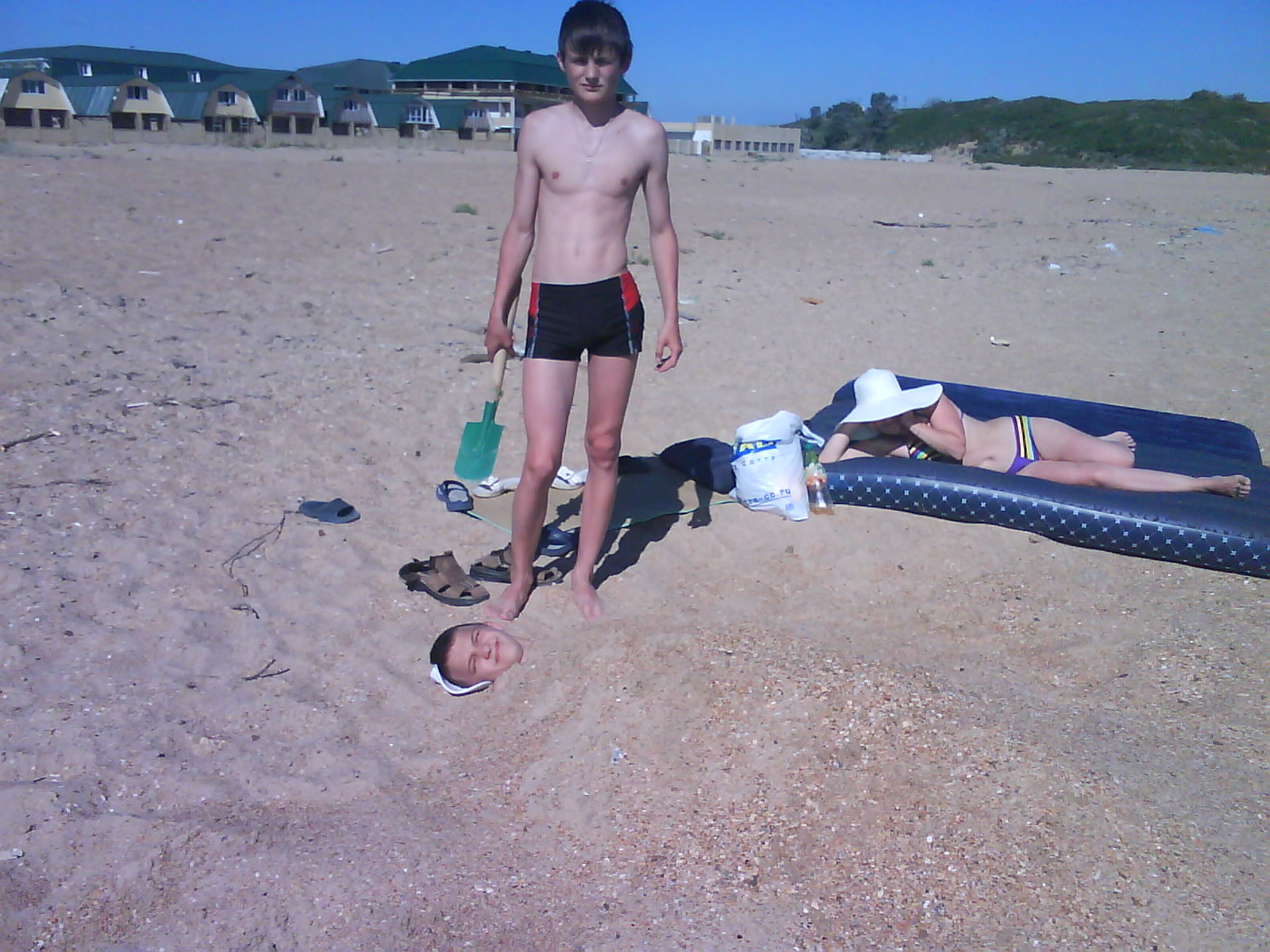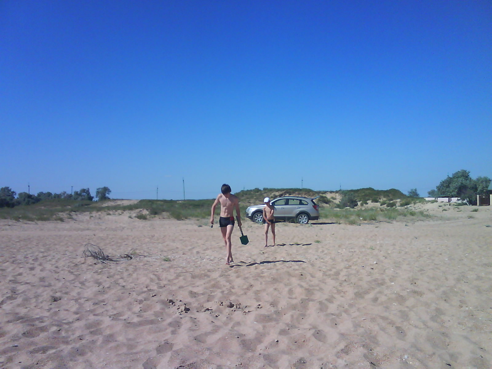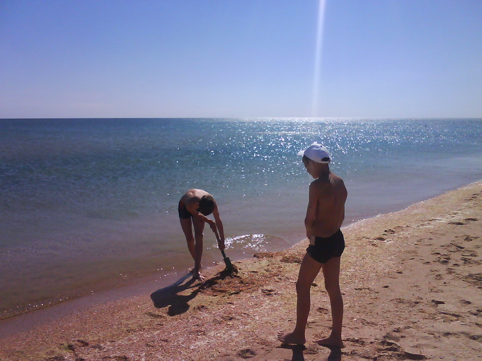 После обеда поехали на ченое море. Есть такое местечко: Виноградное, под Анапой (от Голубицкой до Анапы 58 км.), там можно было съехать прямо на пляж. Именно "можно было". Небольшое наблюдение: все побережье в заборах-загородках "...закрыто крепко все на крючья и запоры..."(Александр Новиков). Долго пылили вдоль моря - заборы, стройки... Наконец узрели - вот оно! На форум читал, как паршиво Каптюша ездит по песку, да еще супруга:"...сейчас застрянем!...все! я выхожу!.." Вот ненадо никого слушать. Нормаль Каптюша по песку ездит. Там, совсем уж у воды стоял старый аутлэндер. И ничего, выполз без вопросов. Черное море - прозрачное, только водоросли...как в болоте. Пляж широченный, народу - по одному человеку на гектар. Изумительно, понравилось. Кстати кукурузу купили на маленьком рынке, по 40руб. за початок. Еще купили малеькую дыньку и огурцы малосольные. Огурцы слопали сразу, такие вкусные.