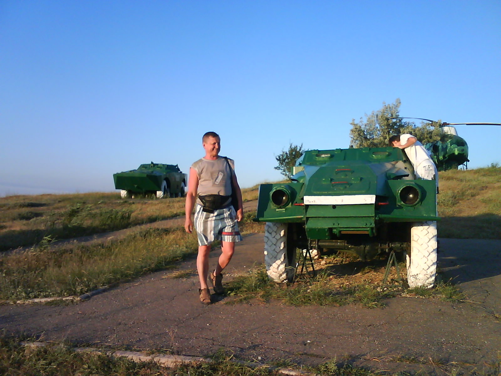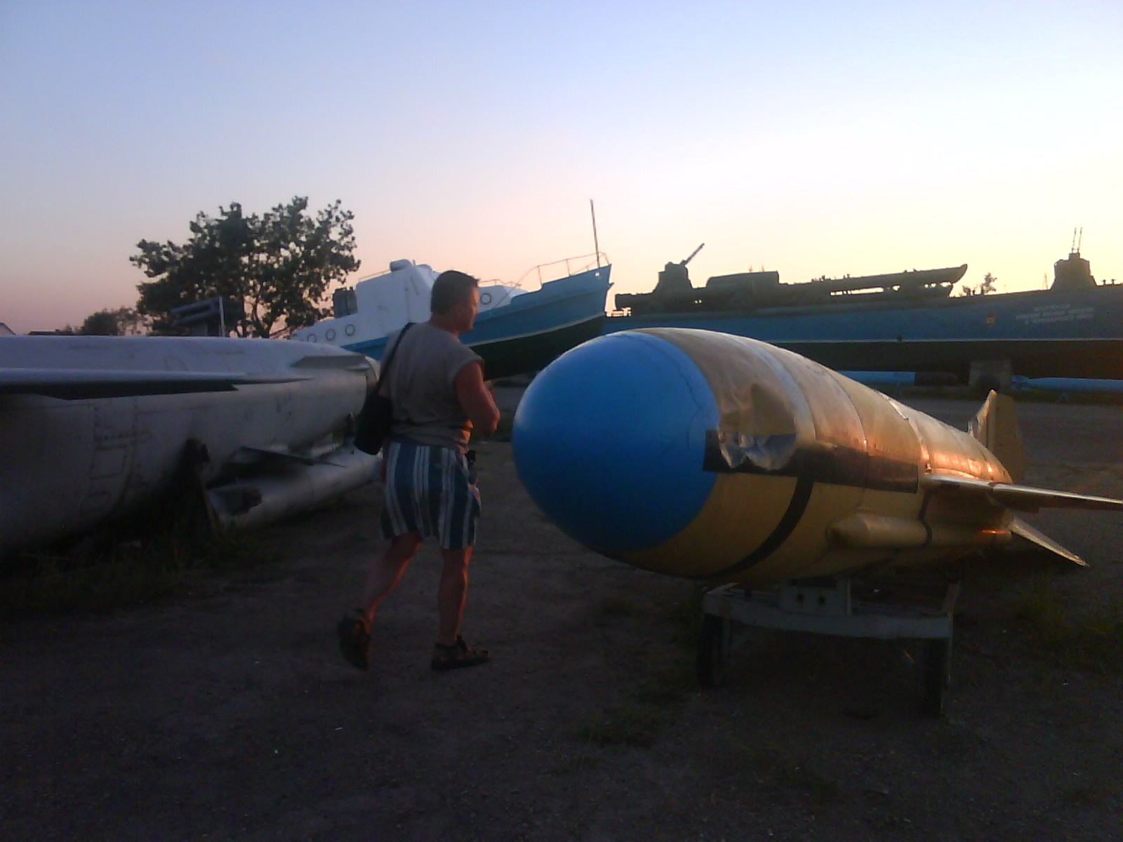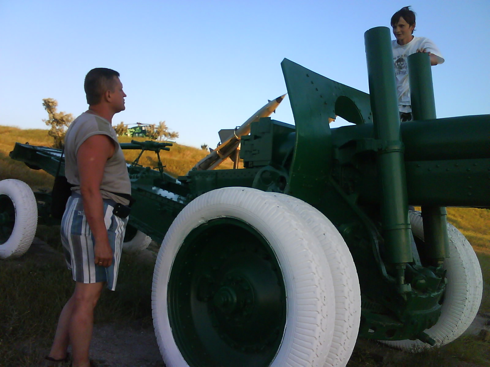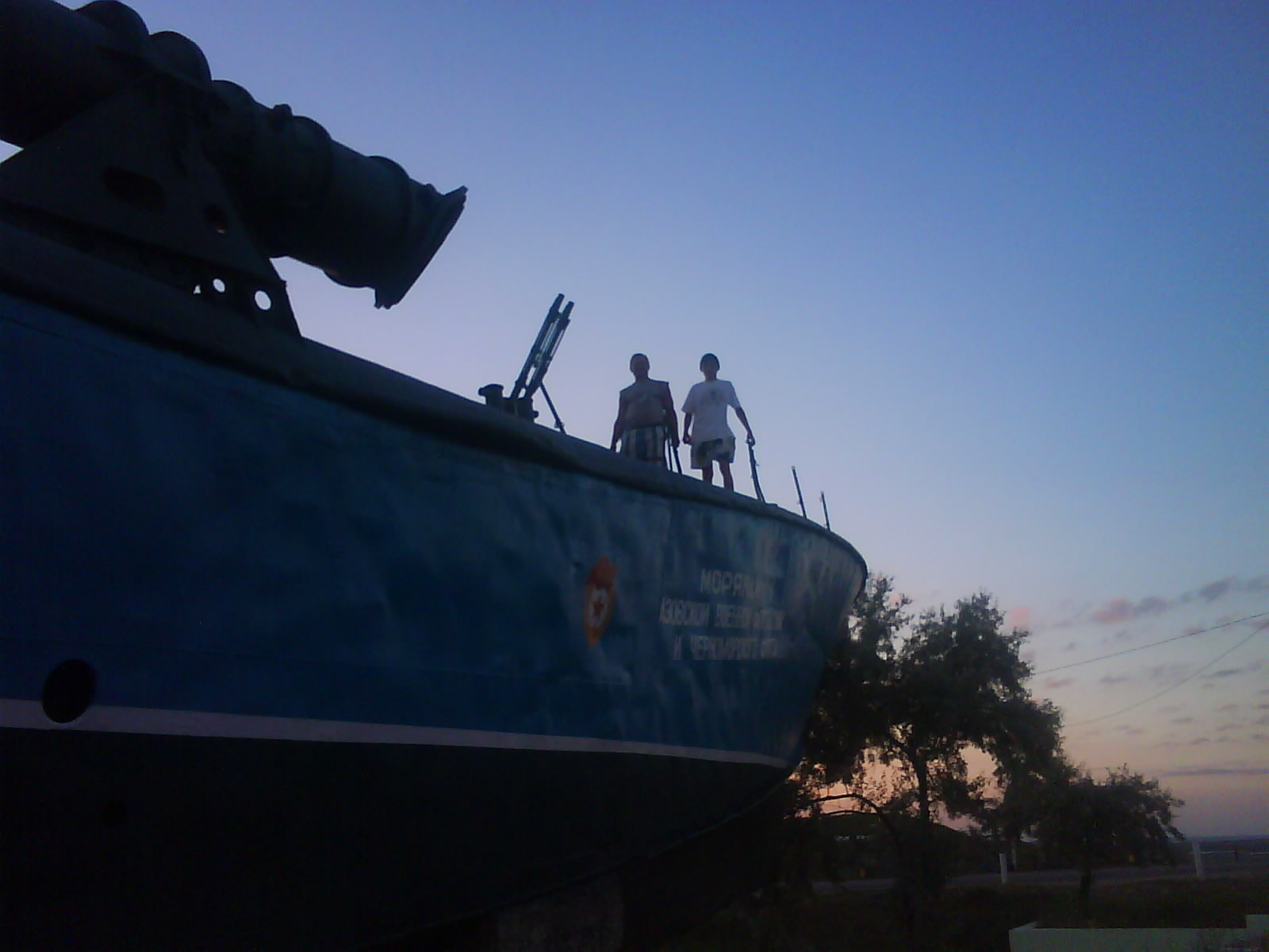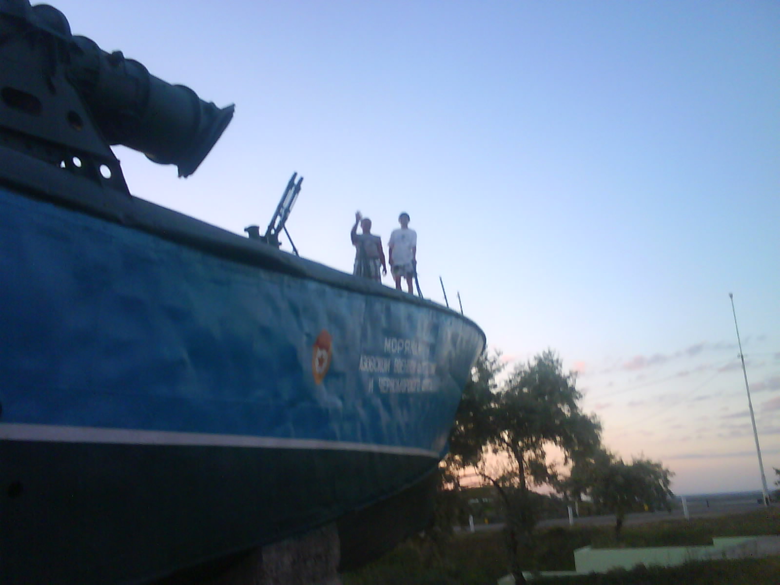 После ужина поехали на "Военную горку". Это такой музей военной техники под открытым небом, в Темрюке. Описывать не буду, есть куча фоток. Димка, подкалывая меня за толстопузую комплекцию, проиграл щелбан - не смог залезть на торпедный катер, а я залез. Потом то и он залез, но договор есть договор. Мамурля пыталась сфоткать значимое событие...неполучилось, к сожалению.