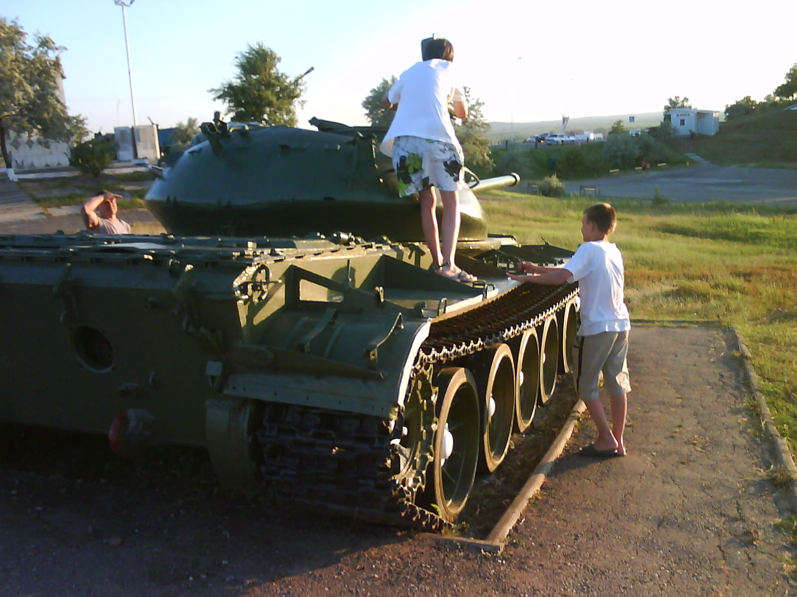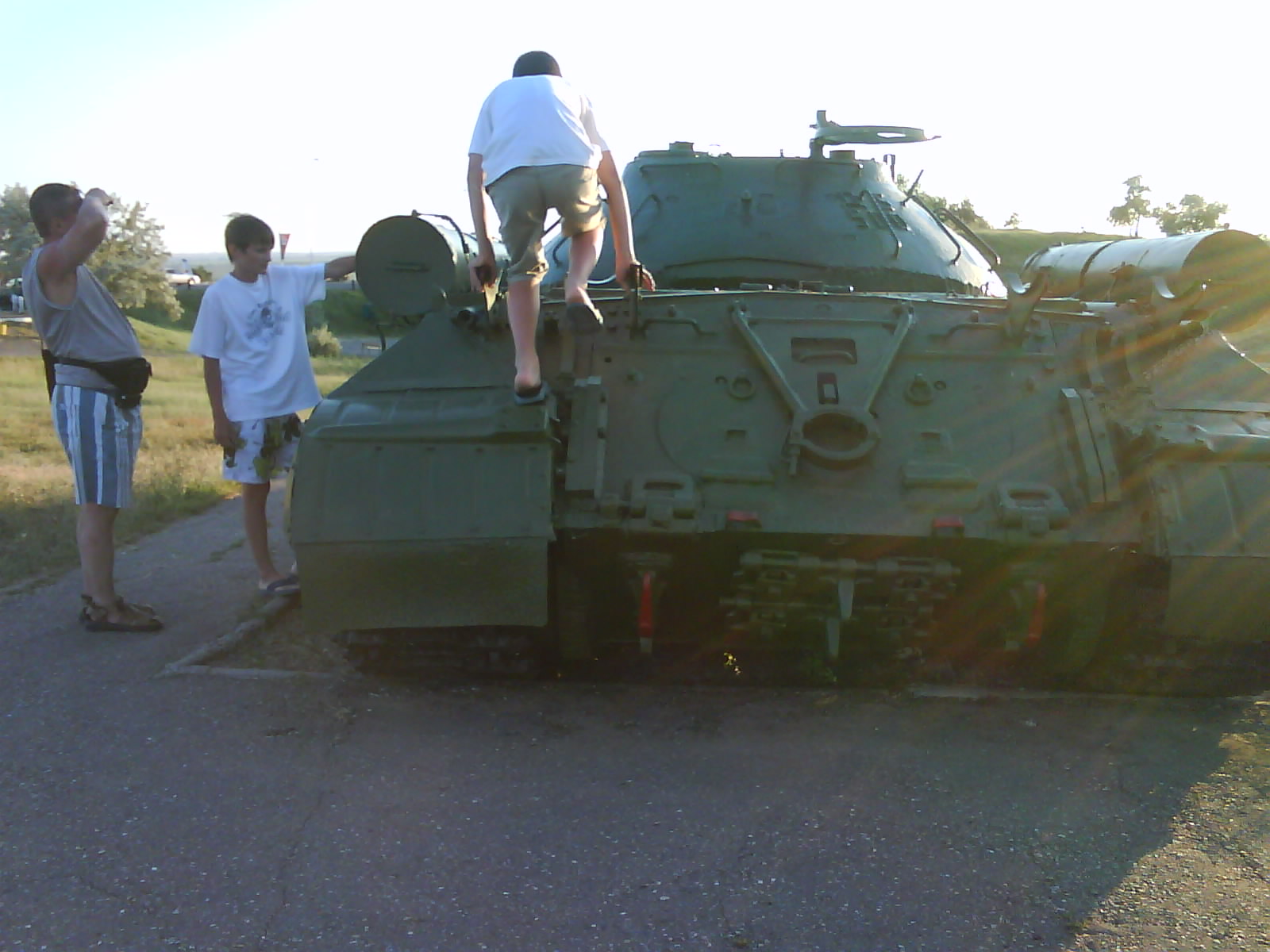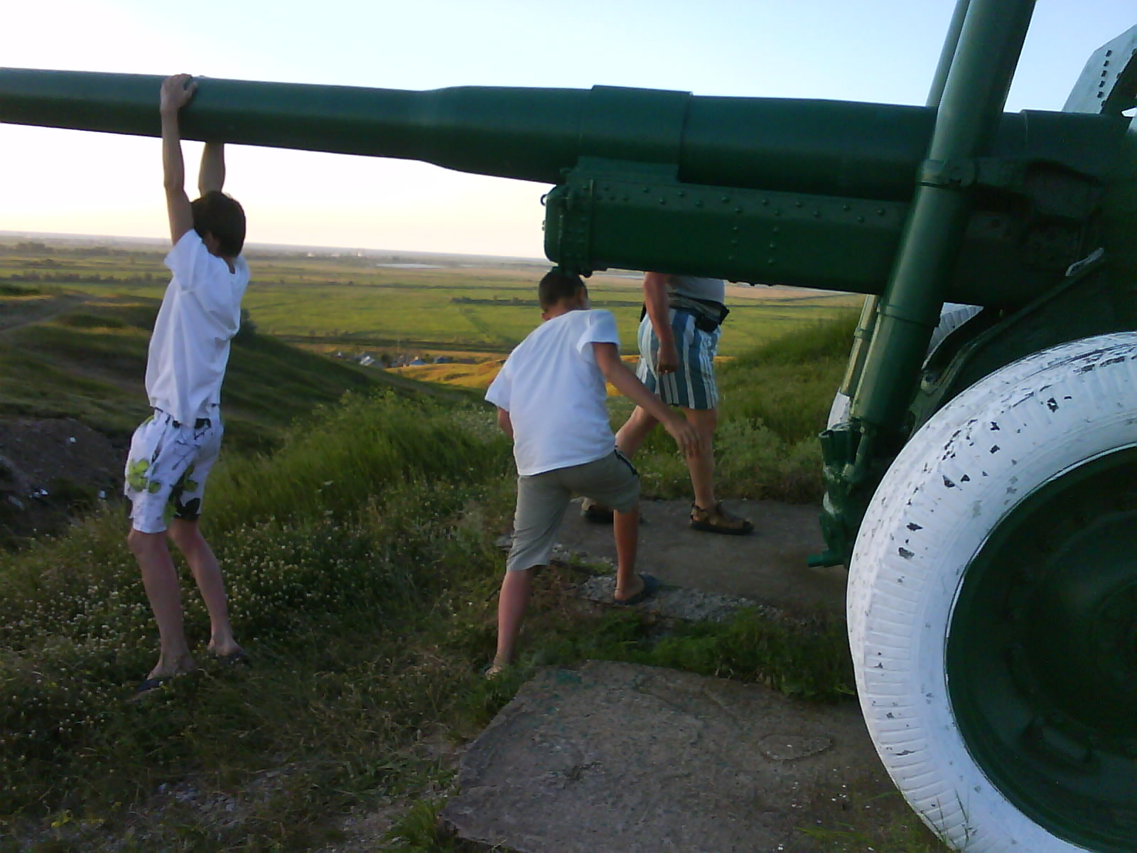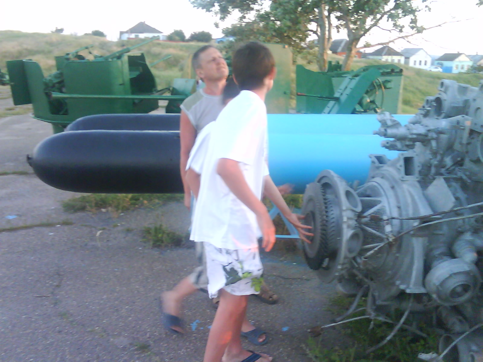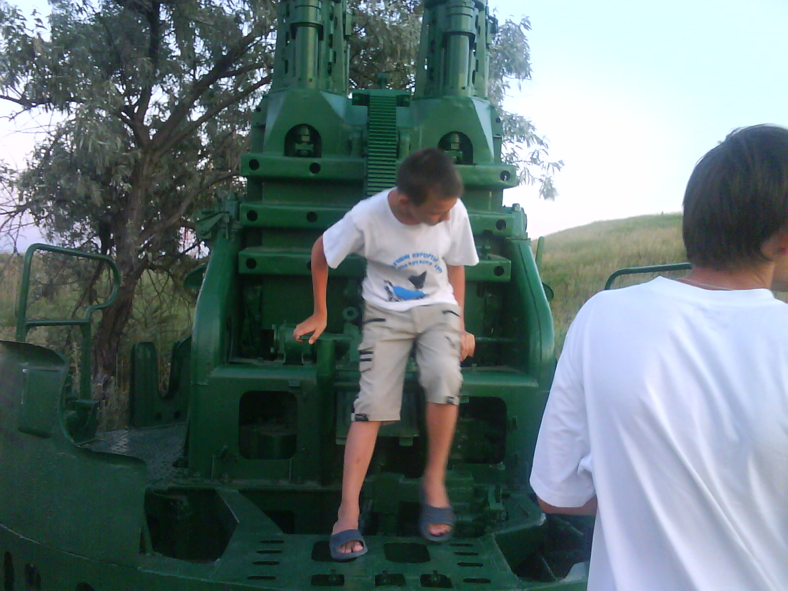 После ужина поехали на "Военную горку". Это такой музей военной техники под открытым небом, в Темрюке. Описывать не буду, есть куча фоток. Димка, подкалывая меня за толстопузую комплекцию, проиграл щелбан - не смог залезть на торпедный катер, а я залез. Потом то и он залез, но договор есть договор. Мамурля пыталась сфоткать значимое событие...неполучилось, к сожалению.