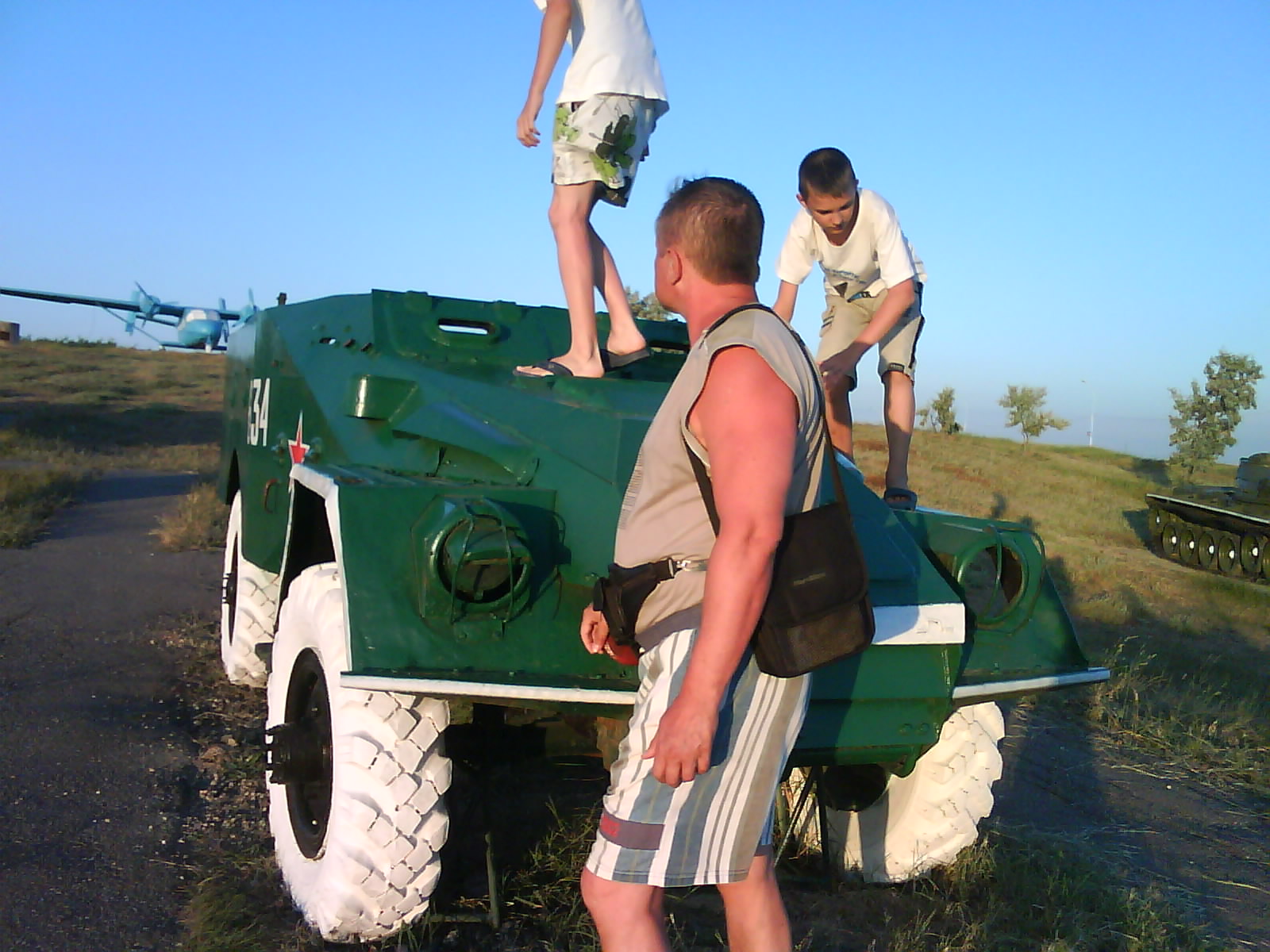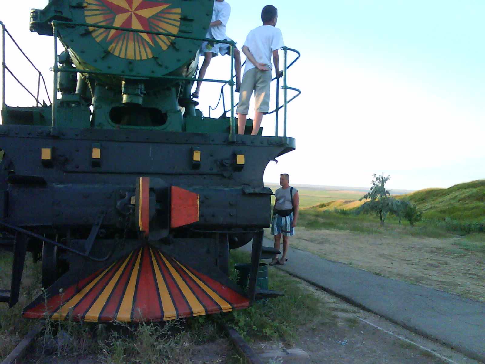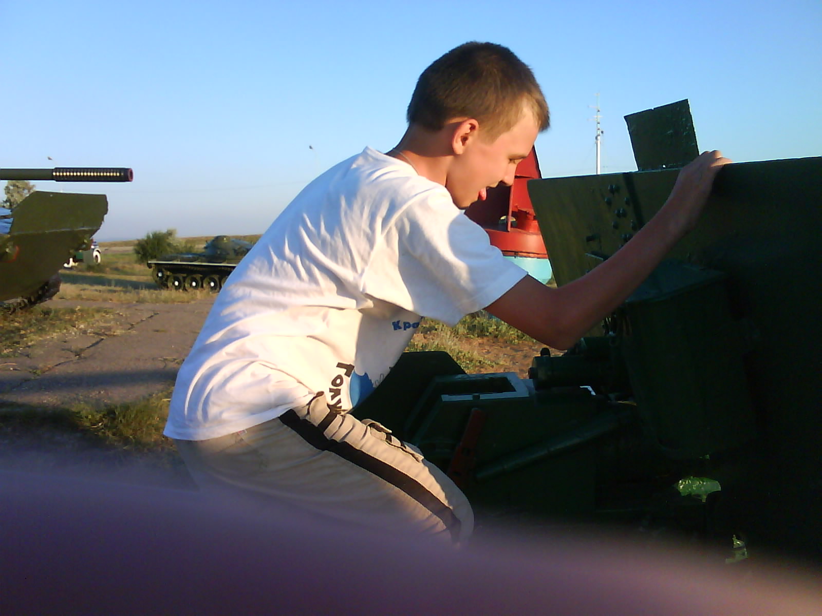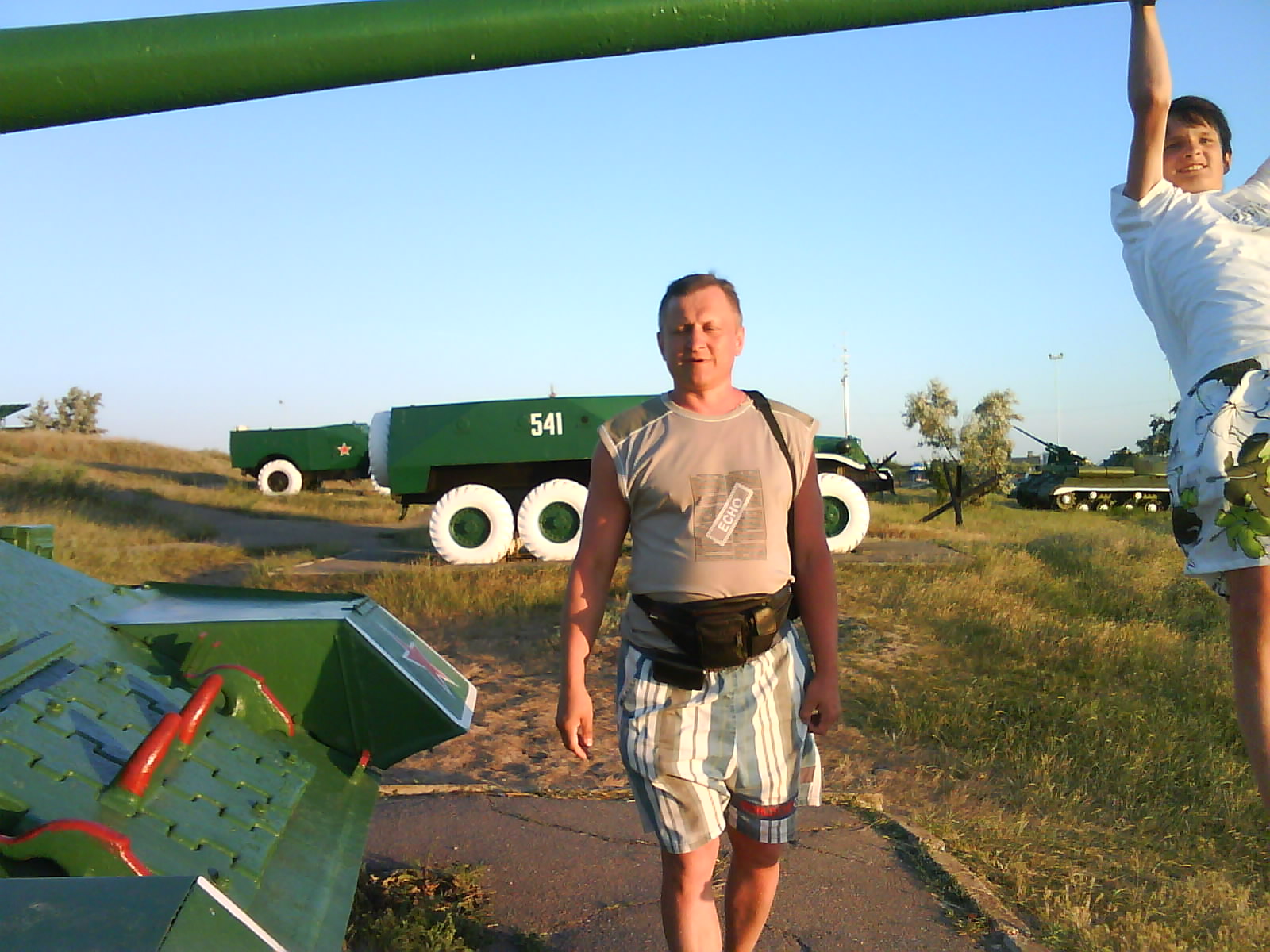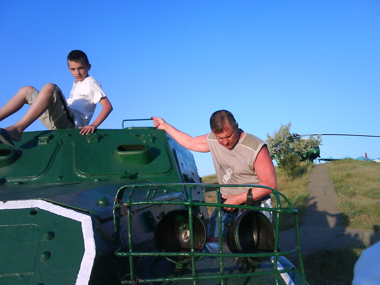 После ужина поехали на "Военную горку". Это такой музей военной техники под открытым небом, в Темрюке. Описывать не буду, есть куча фоток. Димка, подкалывая меня за толстопузую комплекцию, проиграл щелбан - не смог залезть на торпедный катер, а я залез. Потом то и он залез, но договор есть договор. Мамурля пыталась сфоткать значимое событие...неполучилось, к сожалению.