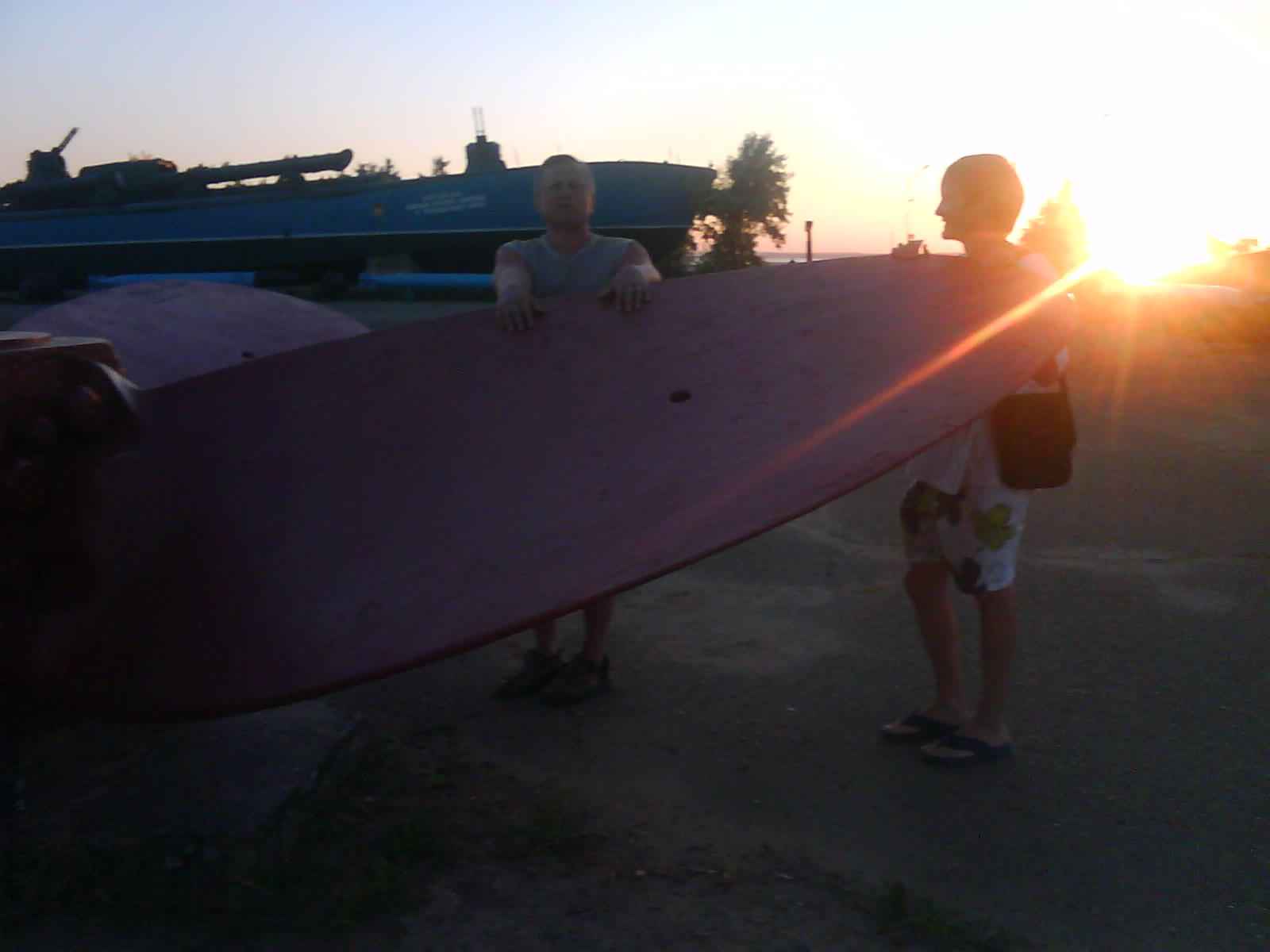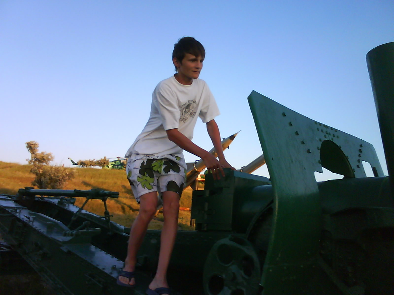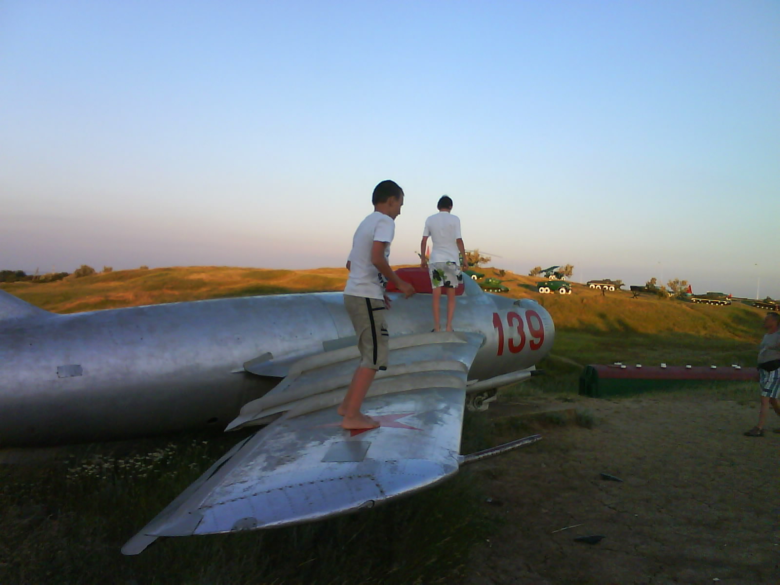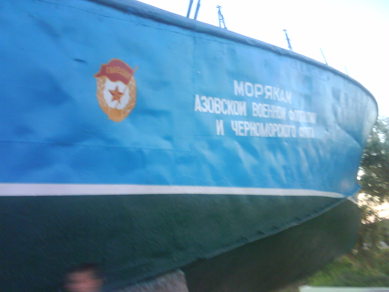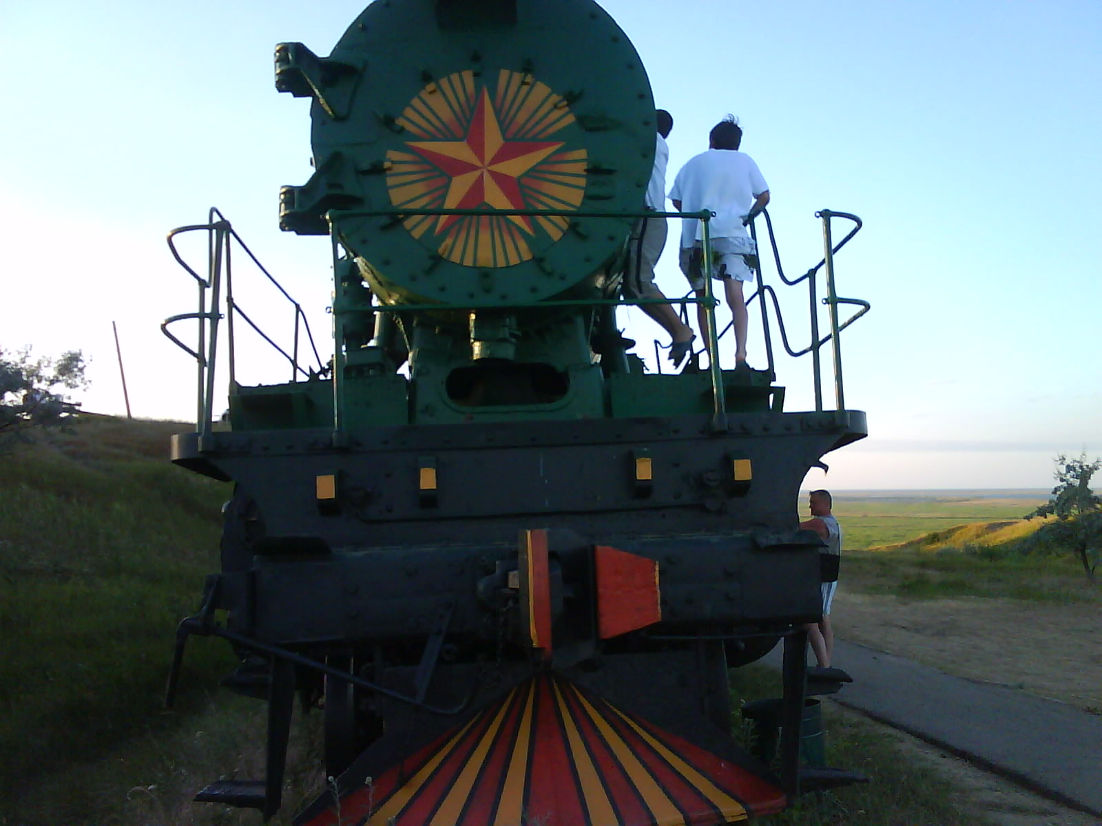 После ужина поехали на "Военную горку". Это такой музей военной техники под открытым небом, в Темрюке. Описывать не буду, есть куча фоток. Димка, подкалывая меня за толстопузую комплекцию, проиграл щелбан - не смог залезть на торпедный катер, а я залез. Потом то и он залез, но договор есть договор. Мамурля пыталась сфоткать значимое событие...неполучилось, к сожалению.