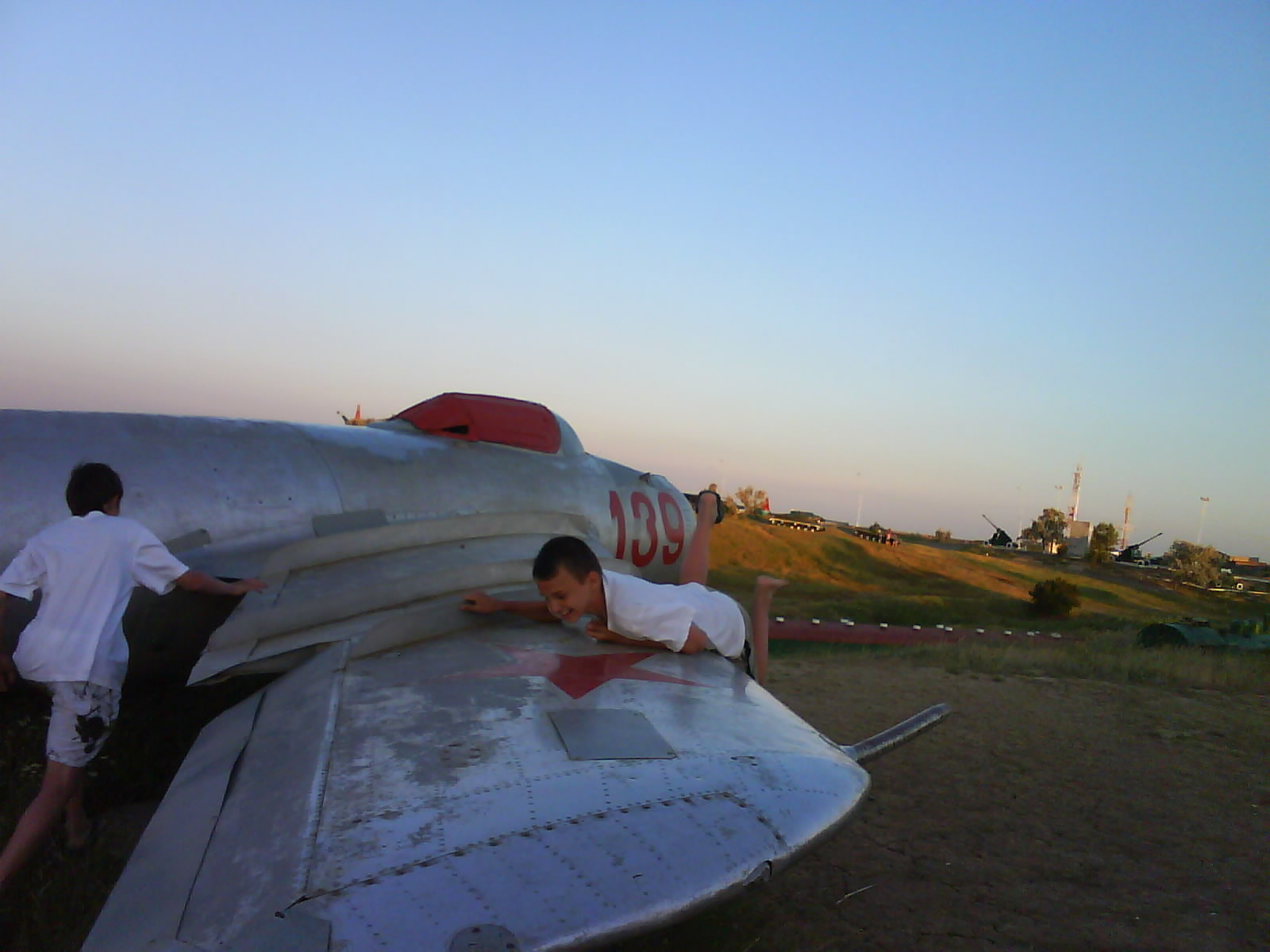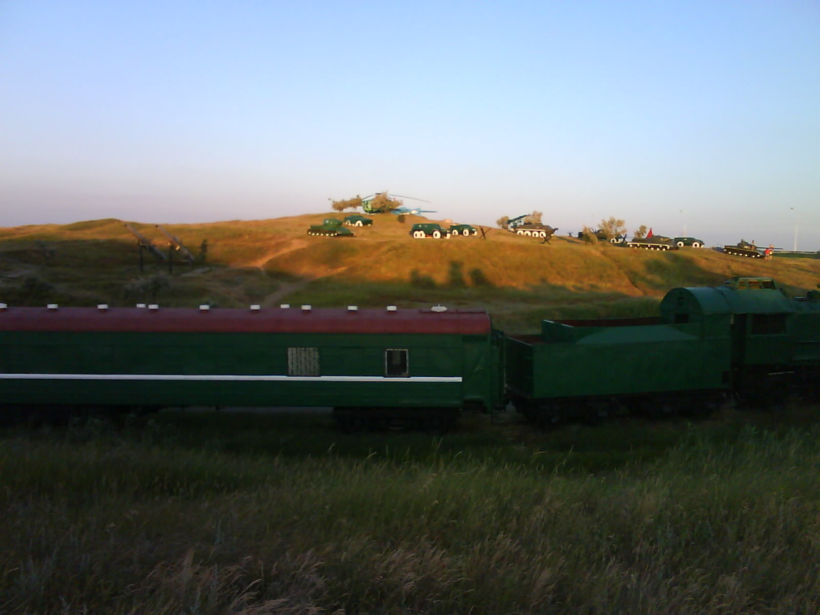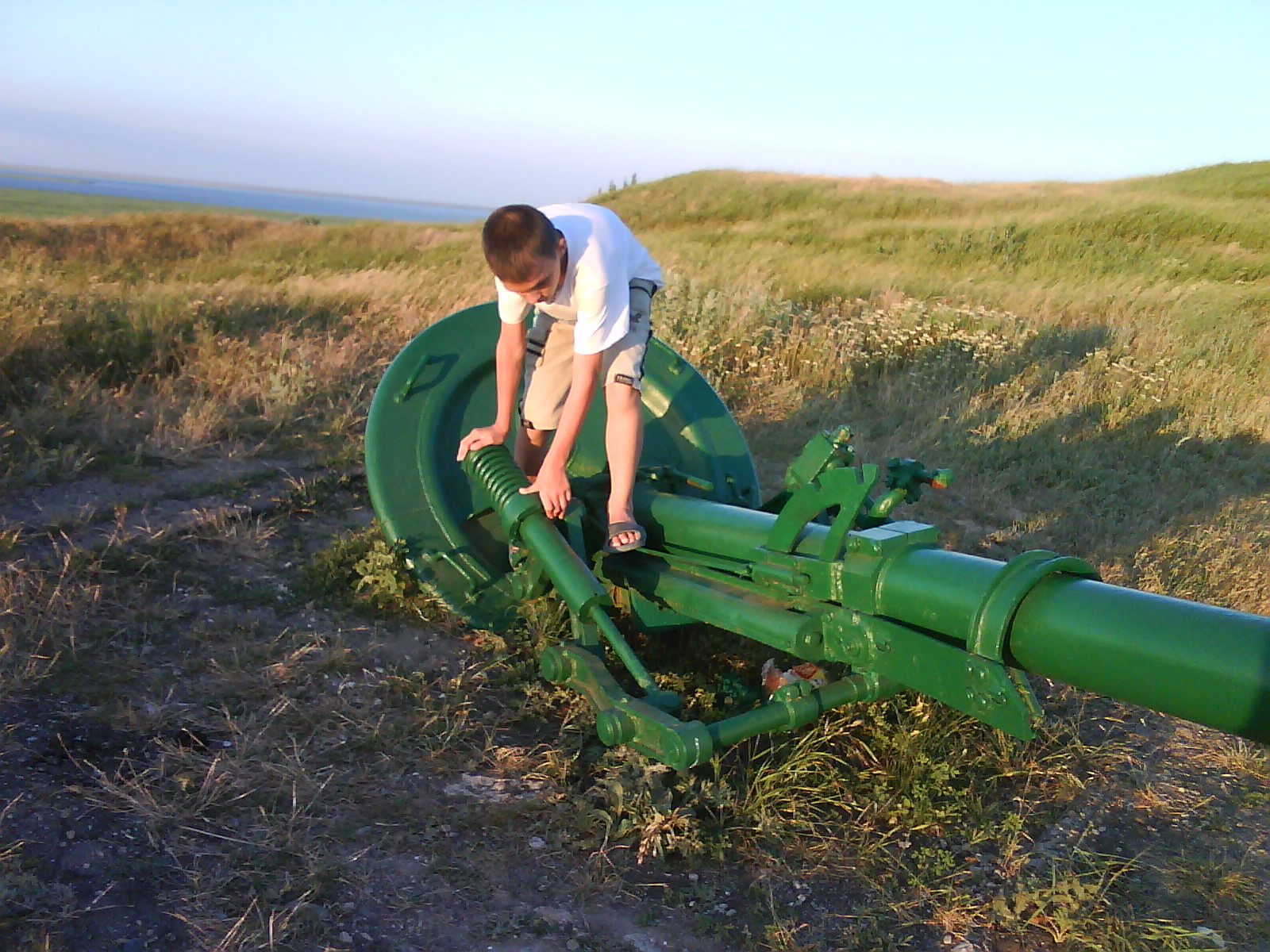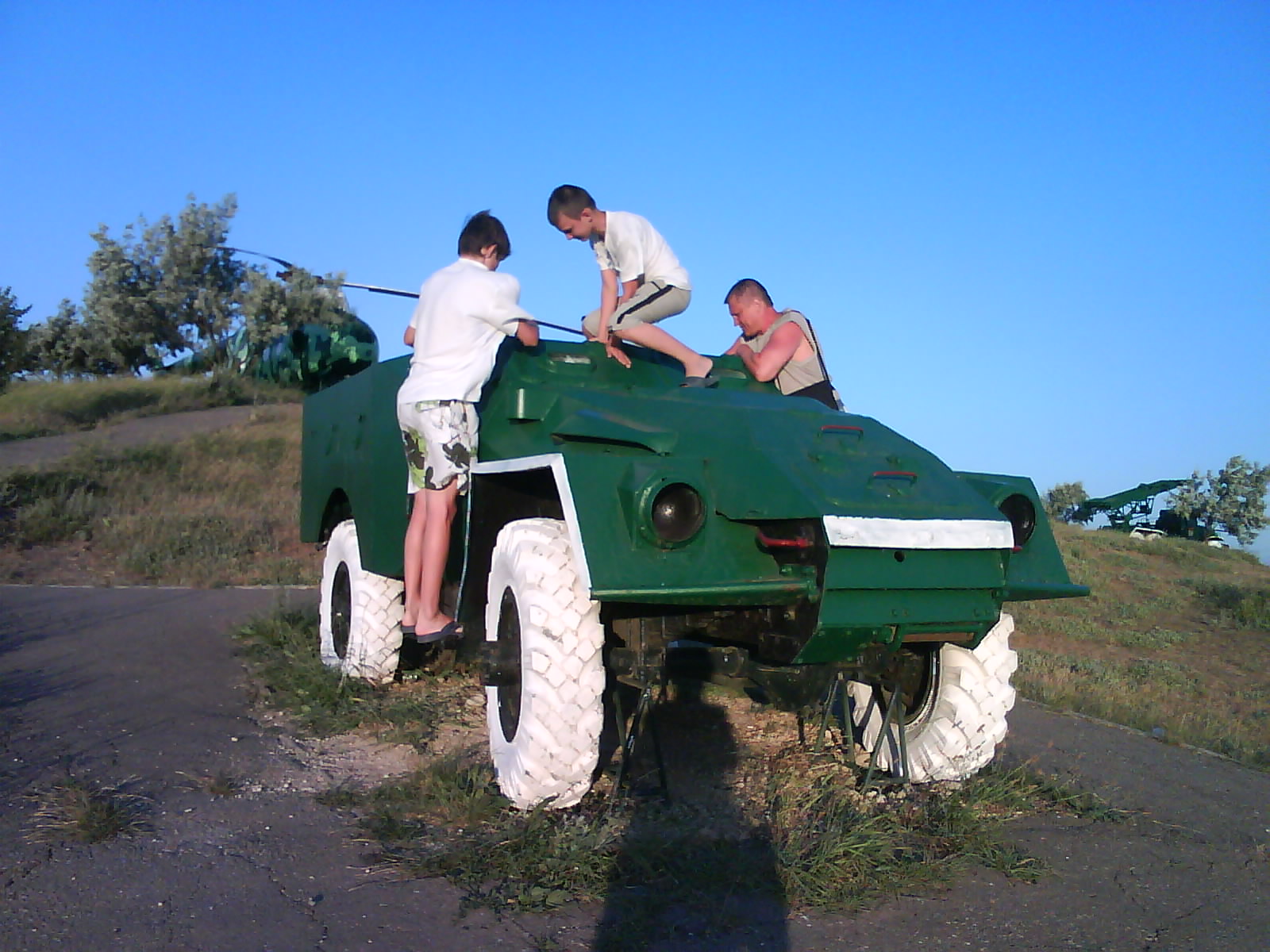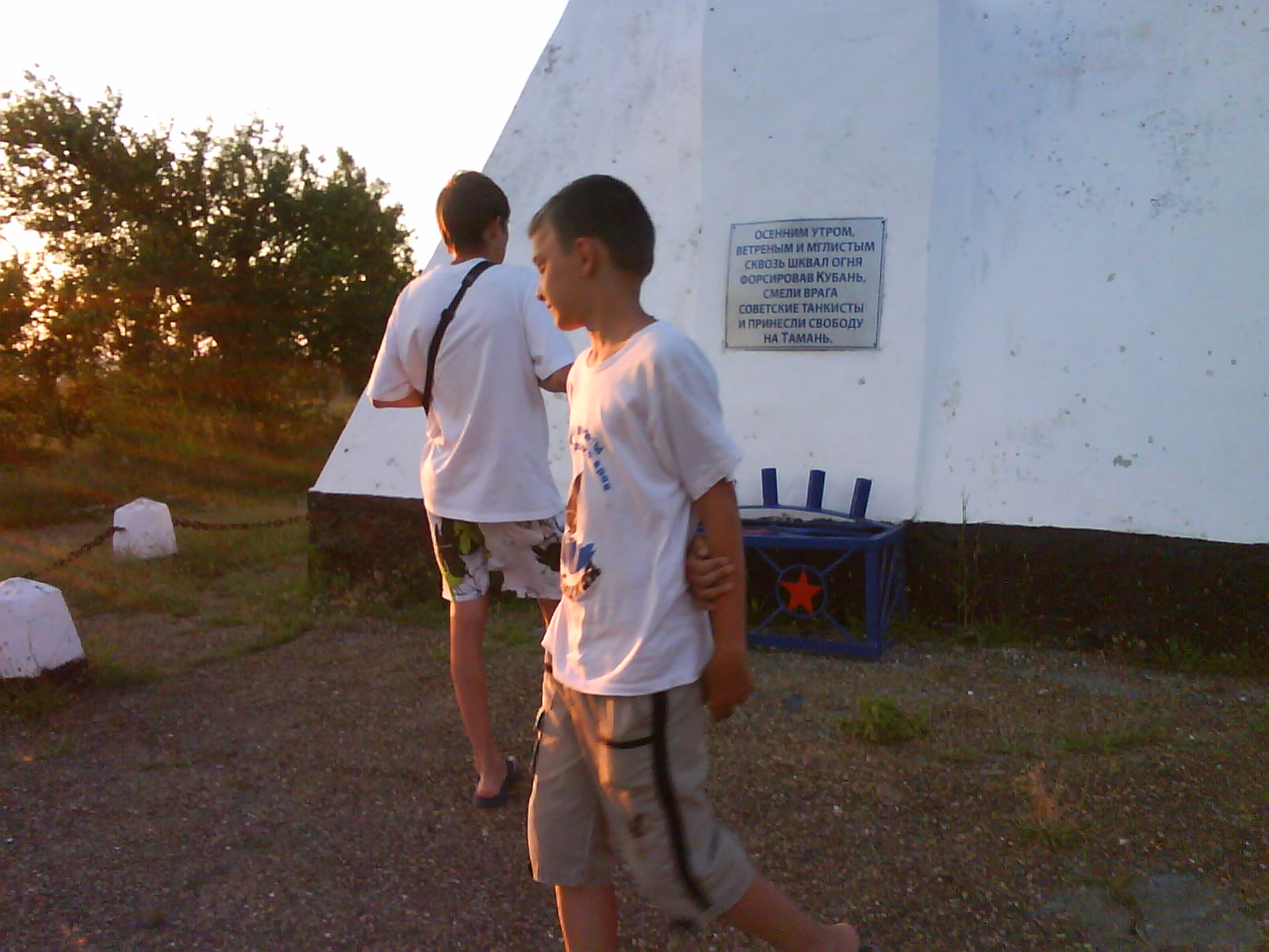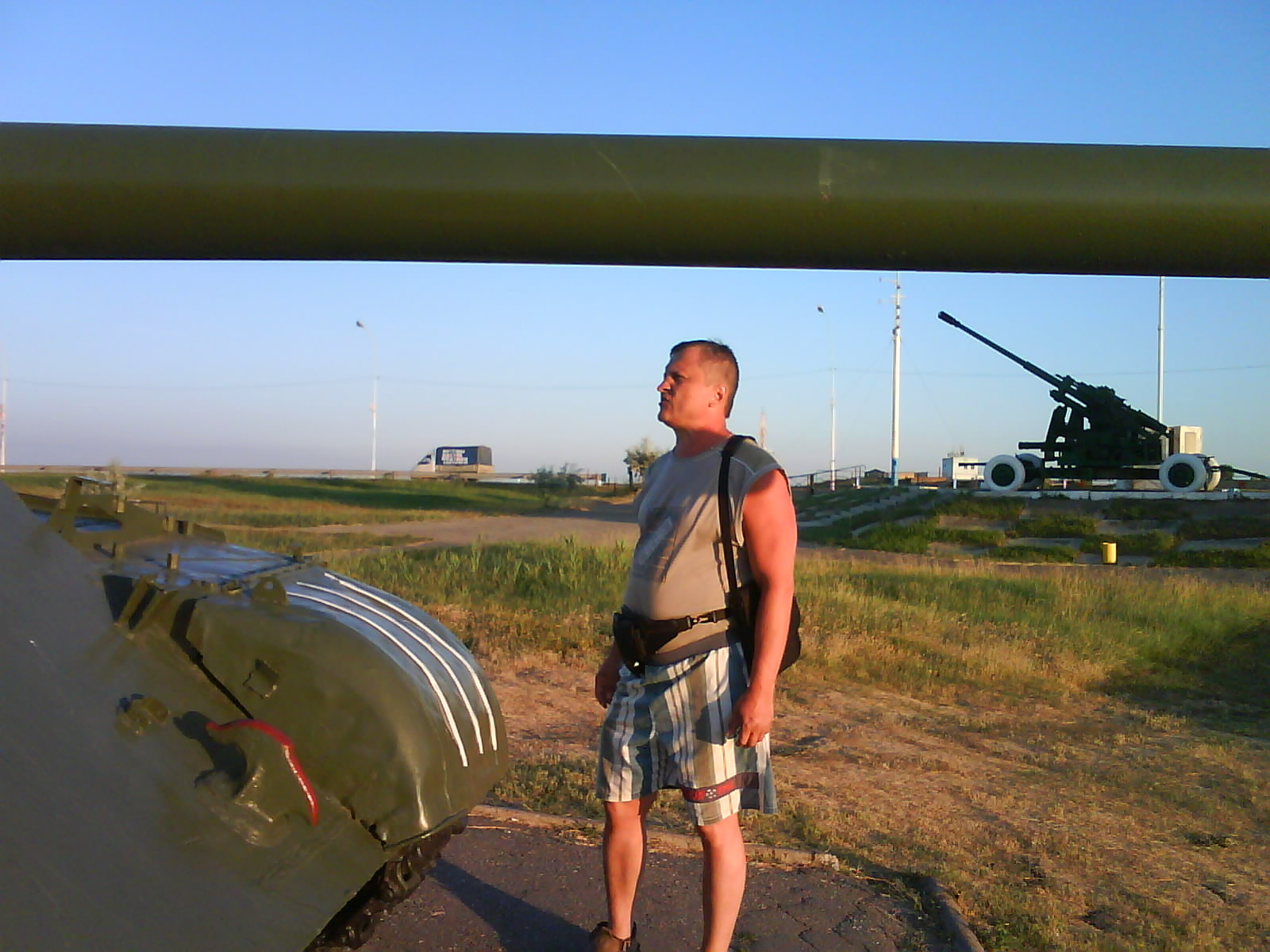 После ужина поехали на "Военную горку". Это такой музей военной техники под открытым небом, в Темрюке. Описывать не буду, есть куча фоток. Димка, подкалывая меня за толстопузую комплекцию, проиграл щелбан - не смог залезть на торпедный катер, а я залез. Потом то и он залез, но договор есть договор. Мамурля пыталась сфоткать значимое событие...неполучилось, к сожалению.