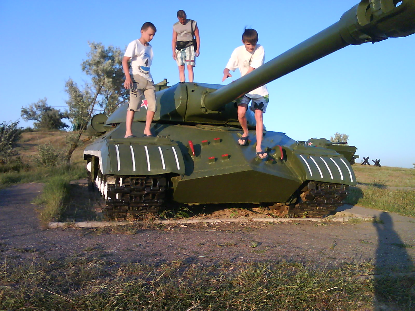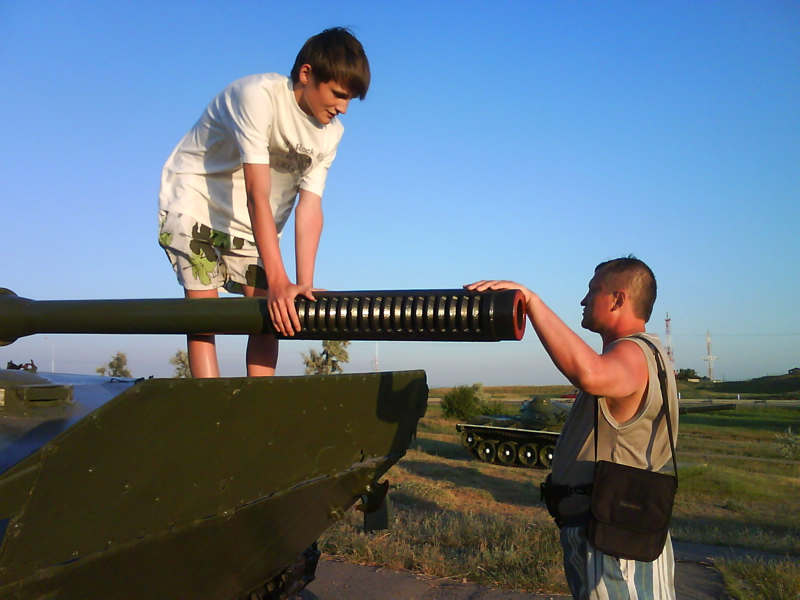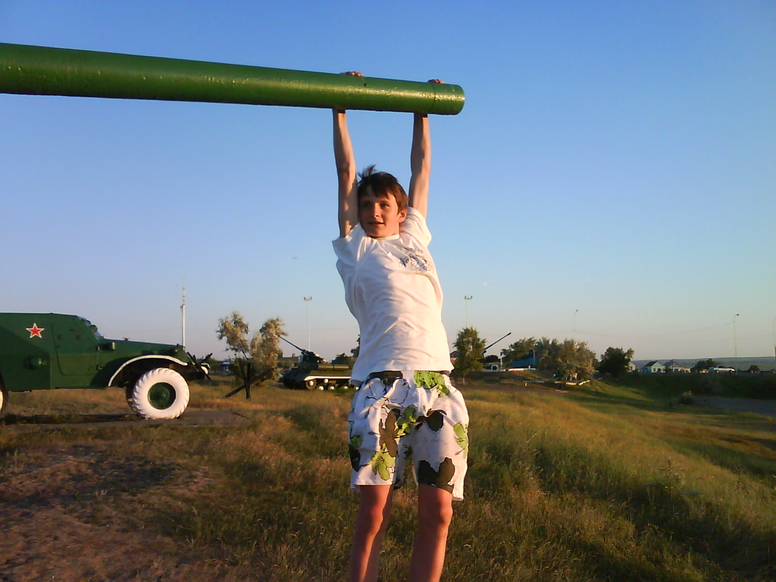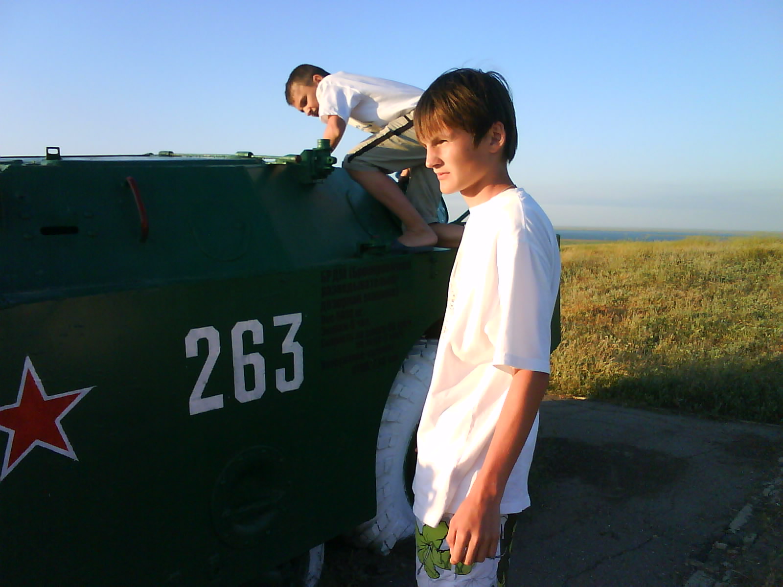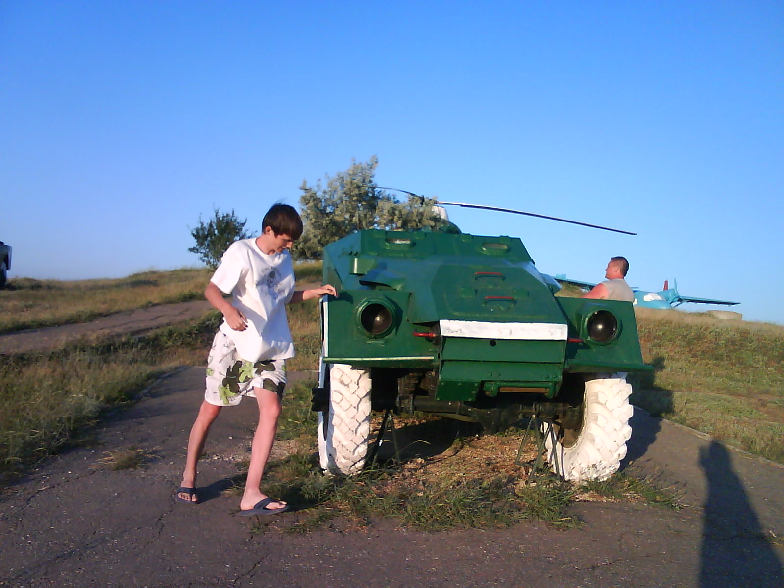 После ужина поехали на "Военную горку". Это такой музей военной техники под открытым небом, в Темрюке. Описывать не буду, есть куча фоток. Димка, подкалывая меня за толстопузую комплекцию, проиграл щелбан - не смог залезть на торпедный катер, а я залез. Потом то и он залез, но договор есть договор. Мамурля пыталась сфоткать значимое событие...неполучилось, к сожалению.
