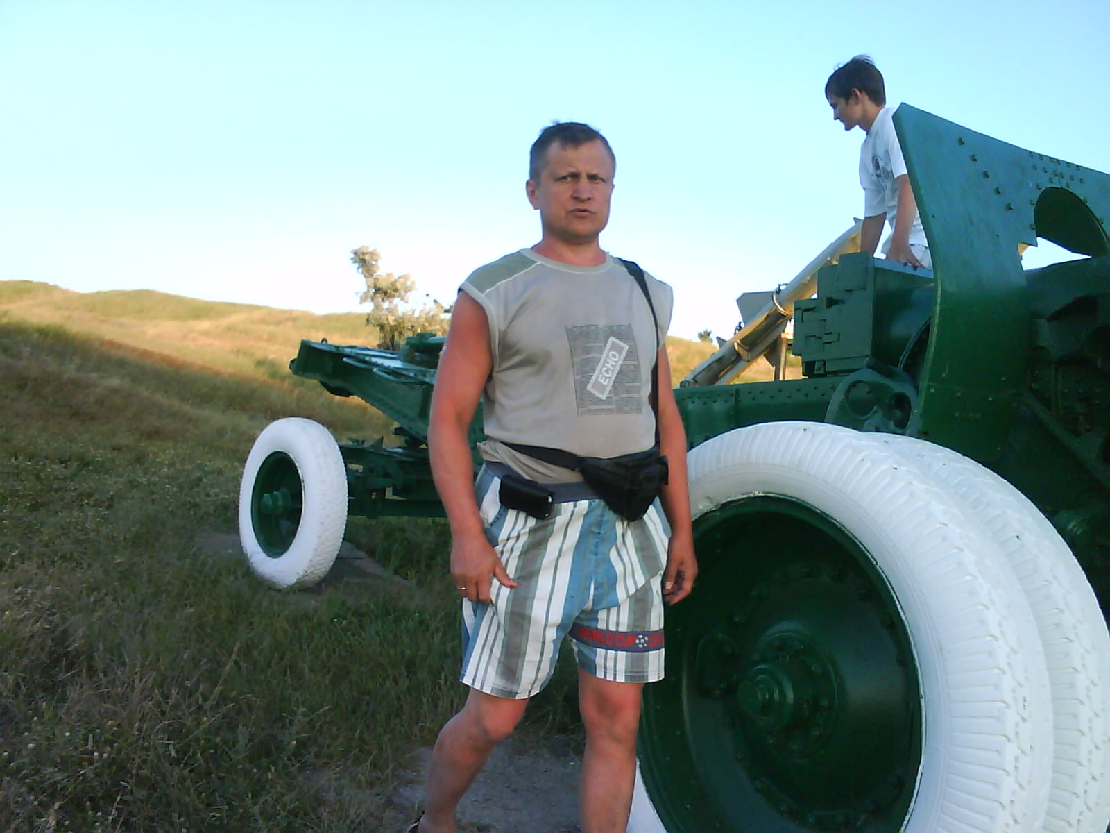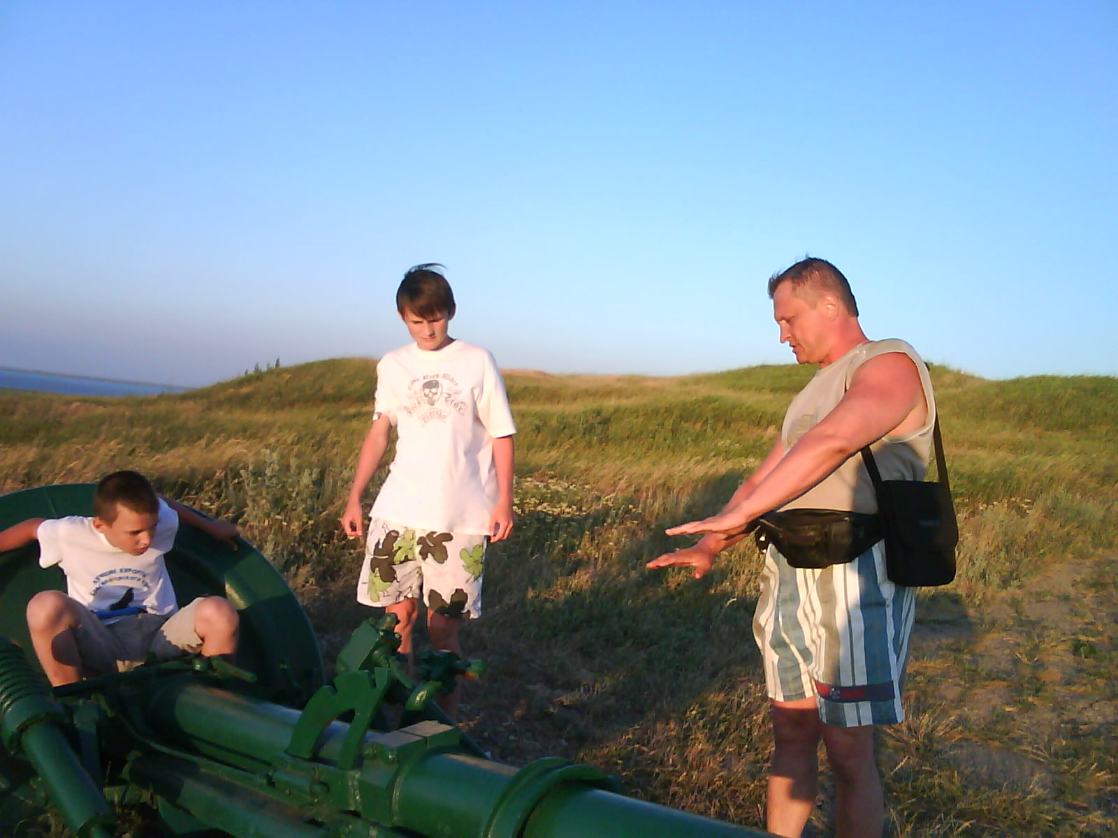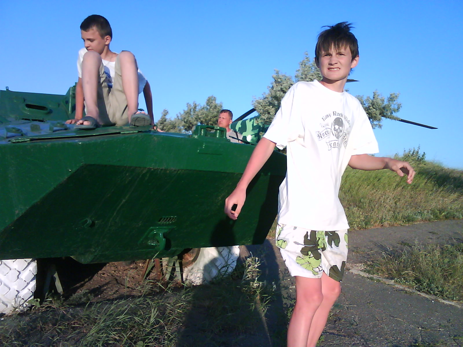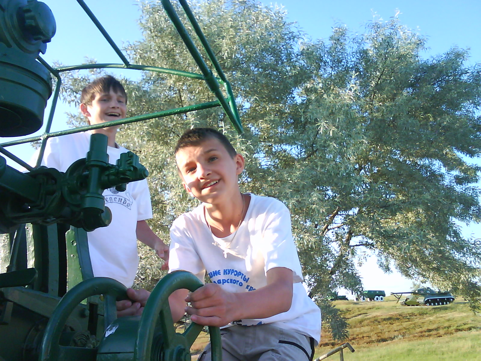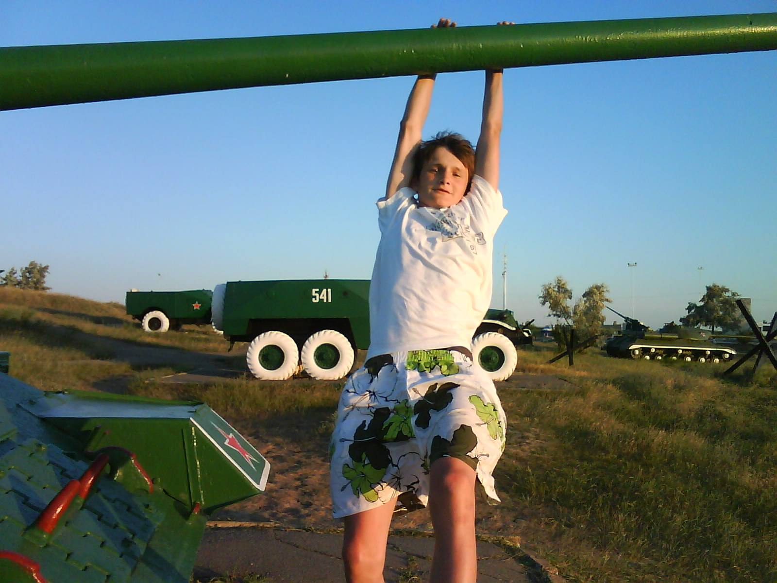 После ужина поехали на "Военную горку". Это такой музей военной техники под открытым небом, в Темрюке. Описывать не буду, есть куча фоток. Димка, подкалывая меня за толстопузую комплекцию, проиграл щелбан - не смог залезть на торпедный катер, а я залез. Потом то и он залез, но договор есть договор. Мамурля пыталась сфоткать значимое событие...неполучилось, к сожалению.