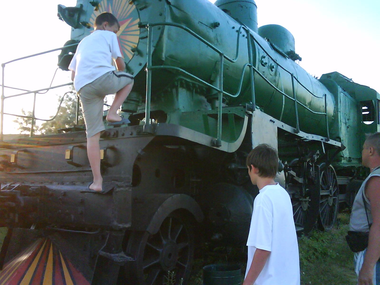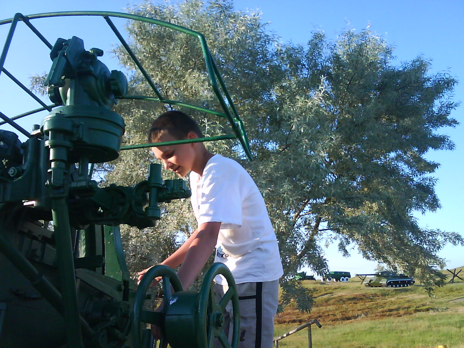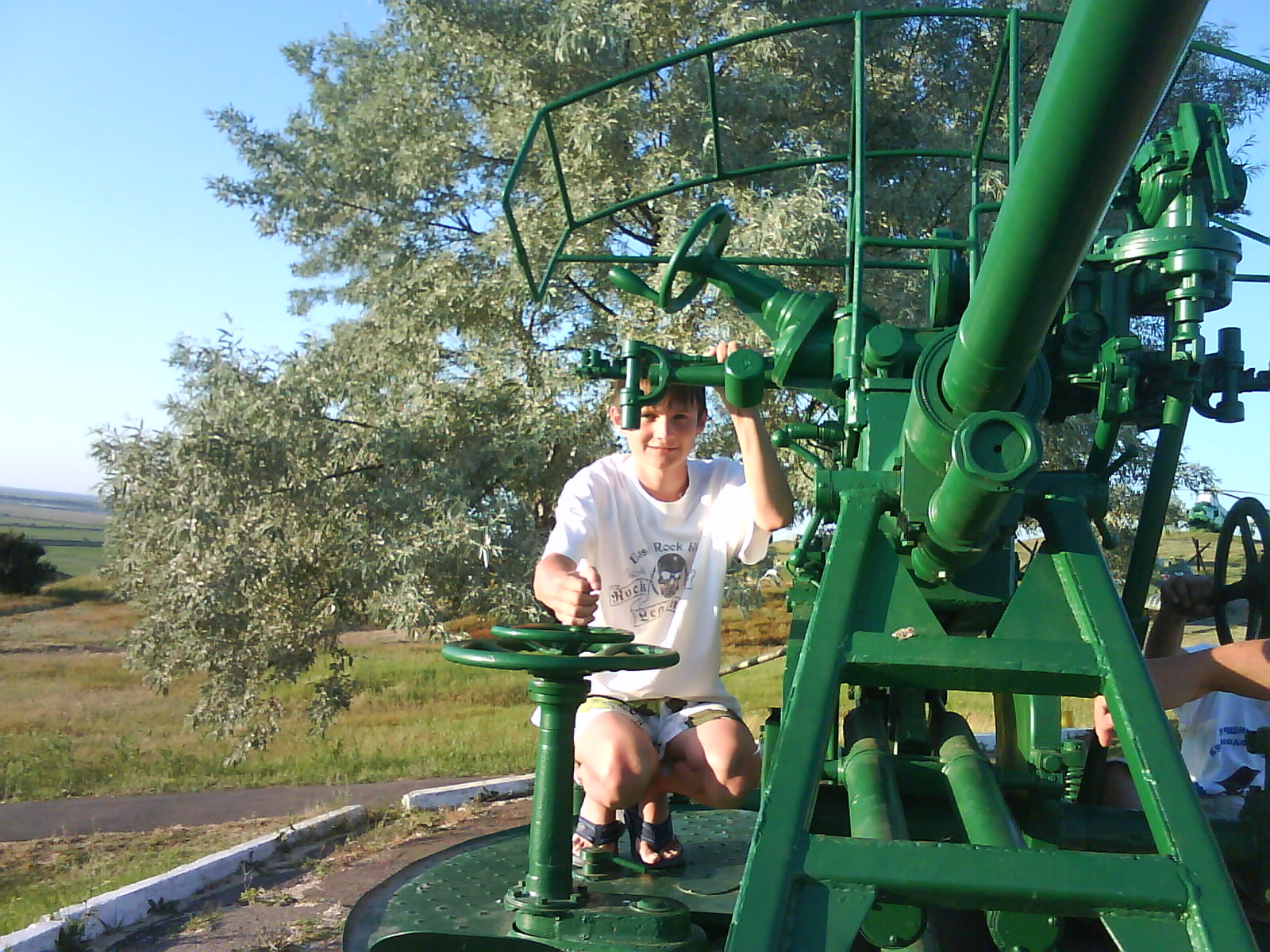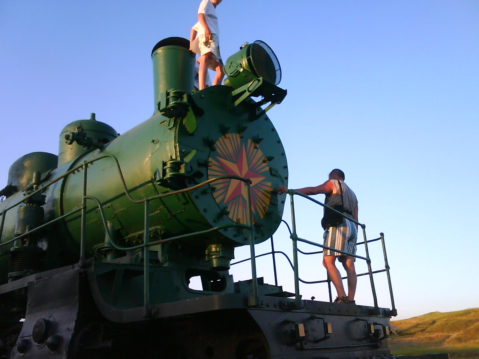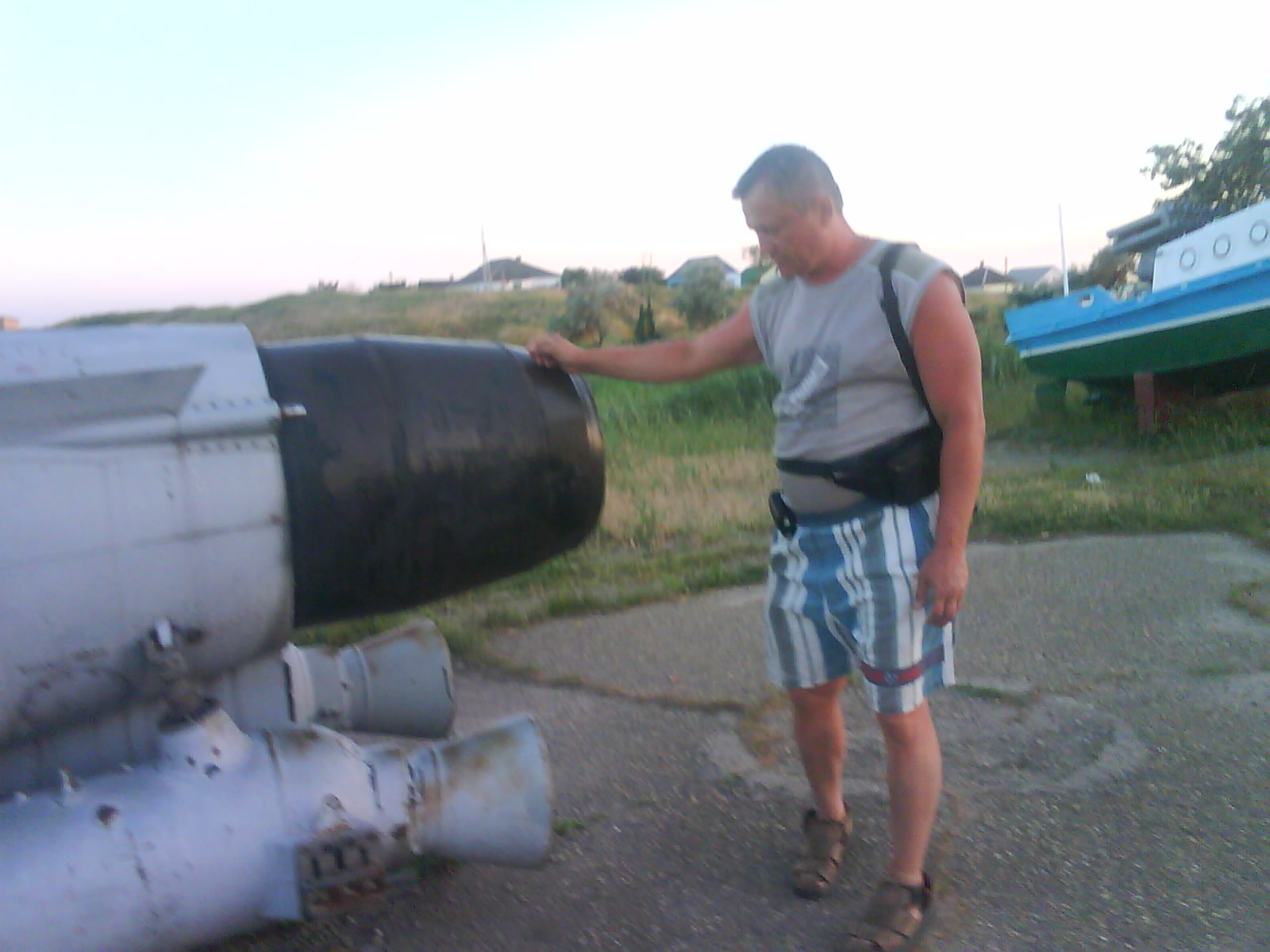 После ужина поехали на "Военную горку". Это такой музей военной техники под открытым небом, в Темрюке. Описывать не буду, есть куча фоток. Димка, подкалывая меня за толстопузую комплекцию, проиграл щелбан - не смог залезть на торпедный катер, а я залез. Потом то и он залез, но договор есть договор. Мамурля пыталась сфоткать значимое событие...неполучилось, к сожалению.