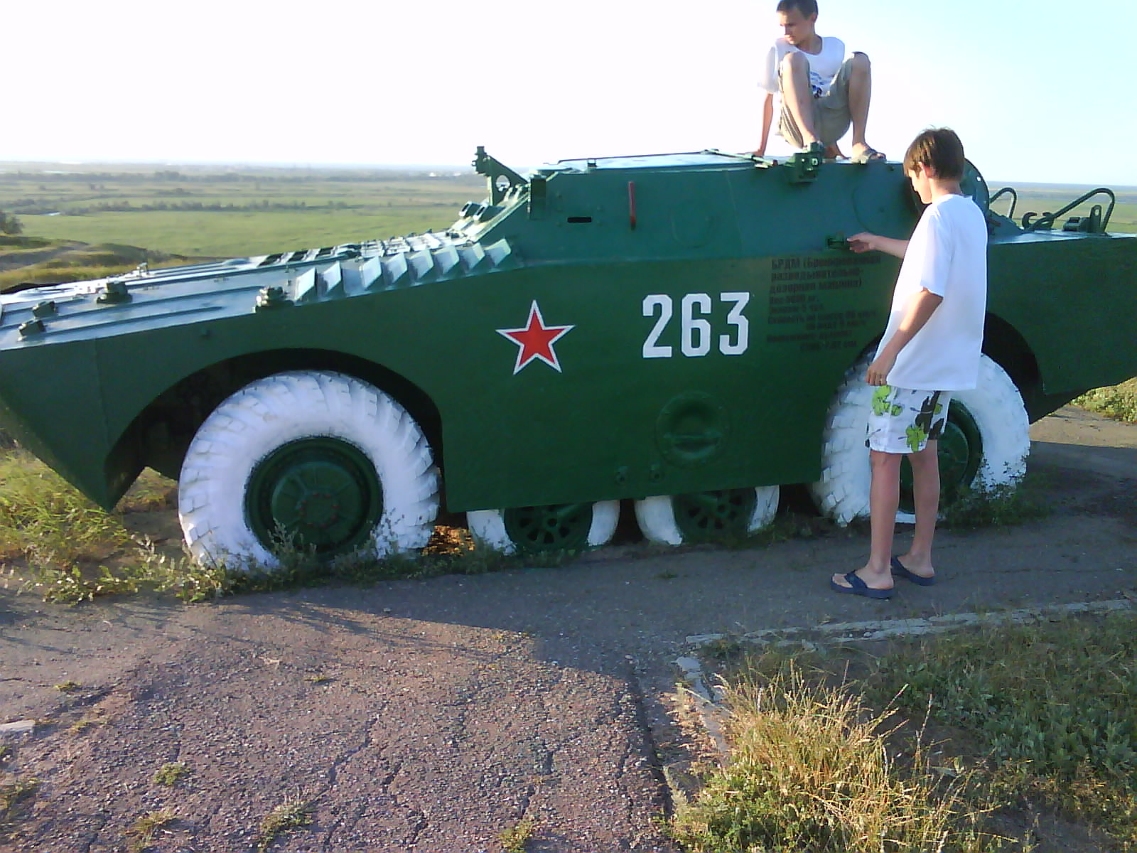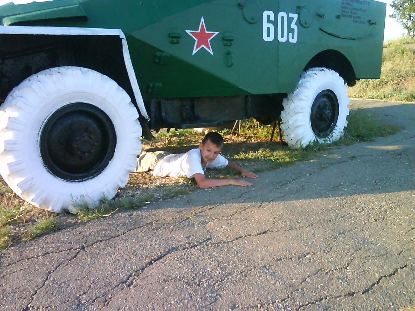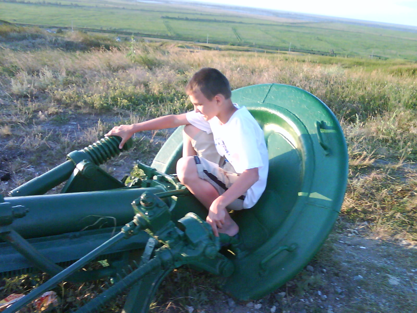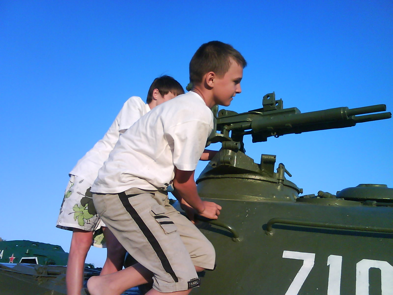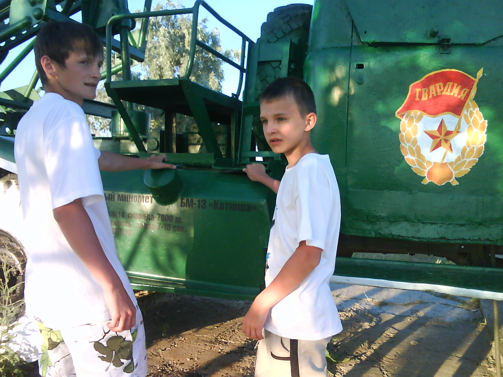 После ужина поехали на "Военную горку". Это такой музей военной техники под открытым небом, в Темрюке. Описывать не буду, есть куча фоток. Димка, подкалывая меня за толстопузую комплекцию, проиграл щелбан - не смог залезть на торпедный катер, а я залез. Потом то и он залез, но договор есть договор. Мамурля пыталась сфоткать значимое событие...неполучилось, к сожалению.