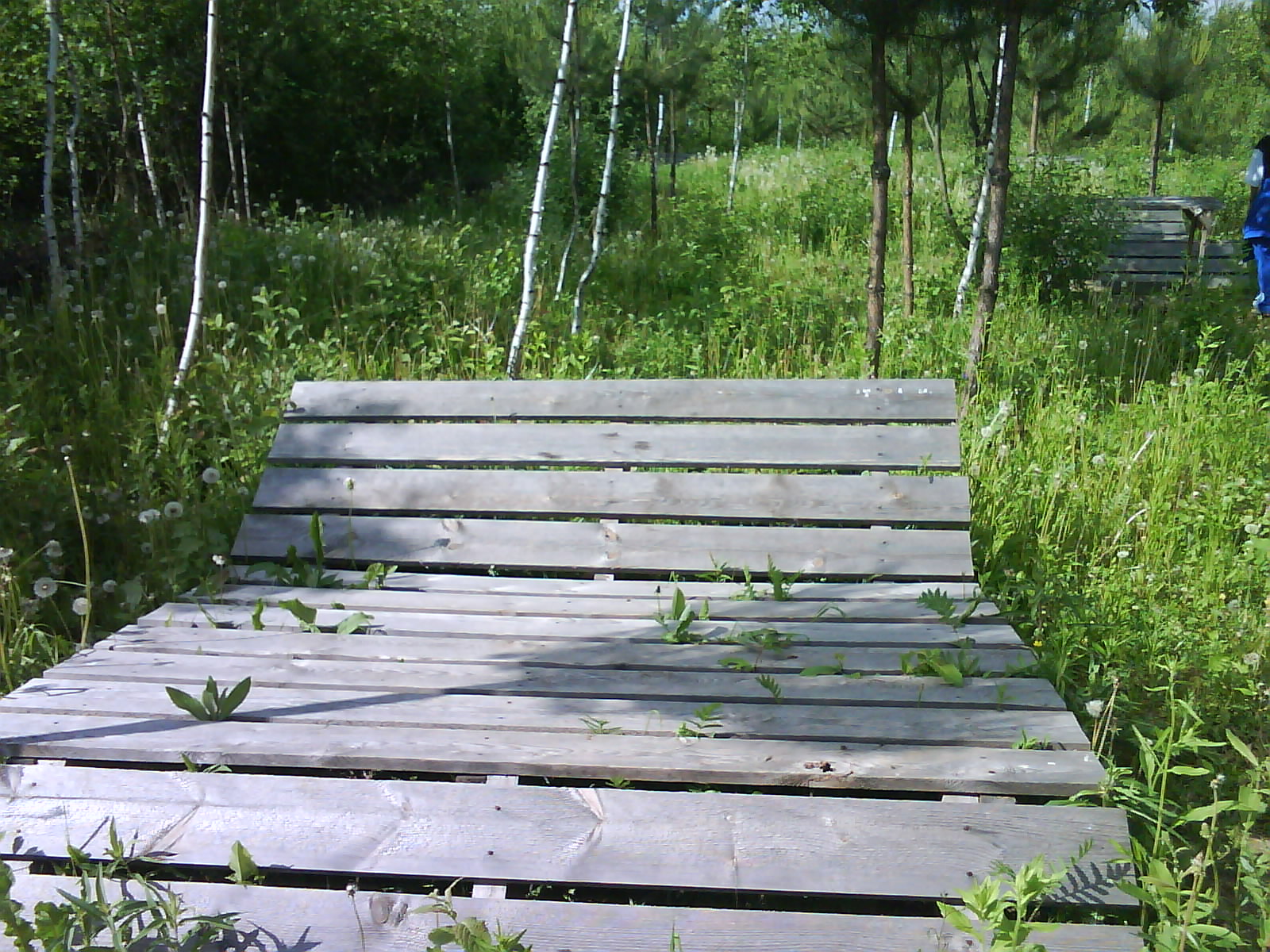 | А вот интересные сооружения: деревянные лежаки. Т.е. сделаны такие лежанки с хорошо подобранной, физиологической кривизной поверхности. Можно стелить подстилочку - и лежать отдыхать. |